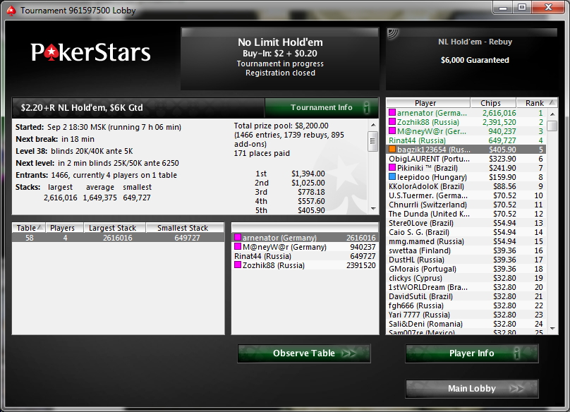 Всем привет! Вчера фтп наконец-то отдал мне часть долга. Очень жаль, что не выиграл турнир, потому что чиповал начиная топ 45, да и на финалке не давал себя в обиду (к слову сказать карта шла весь турнир). Но в топ 3 случлись вот такие не приятные раздачи. Вот эту сыграл не очень. Терн надо было наверное падать. Но ривер точно бы сдавался. 12k/24k No Limit Holdem FullTiltPoker 3 Players Hand Conversion Powered by weaktight.com The Double Rush (Rebuy) Stacks: BTN bagzik (1,855k) 77bb SB auzzieriverside ( 647k) 27bb BB RossyBee (1,991k) 83bb Blinds: 12k/24k Ante 3k Pre-Flop: ( 45k, 3 players) bagzik is BTN A  6 bagzik raises to 60k, auzzieriverside folds, RossyBee calls 36k Flop: A  7  8  ( 141k, 2 players) RossyBee checks, bagzik bets 72k, RossyBee raises to 168k, bagzik calls 96k Turn: 10  ( 477k, 2 players) RossyBee bets 216k, bagzik calls 216k River: J  ( 909k, 2 players) RossyBee checks, bagzik checks Final Pot: 909k bagzik shows A  6 RossyBee shows two pair, Eights and Sevens 7  8 RossyBee wins 909k (net + 462k) bagzik lost 447kЧерез несколько сдач случилась ключевая. Эта мне больше нравится, чем верхняя. Но по результату нравится меньше) 12k/24k No Limit Holdem FullTiltPoker 3 Players Hand Conversion Powered by weaktight.com The Double Rush (Rebuy) Stacks: BTN bagzik (1,468k) 61bb SB auzzieriverside ( 602k) 25bb BB RossyBee (2,423k) 101bb Blinds: 12k/24k Ante 3k Pre-Flop: ( 45k, 3 players) bagzik is BTN K  A bagzik raises to 60k, auzzieriverside folds, RossyBee calls 36k Flop: 8  K  5  ( 141k, 2 players) RossyBee checks, bagzik bets 72k, RossyBee raises to 190k, bagzik calls 118k Turn: 9  ( 521k, 2 players) RossyBee bets 244k, bagzik calls 244k River: 2  ( 1,010k, 2 players) RossyBee bets 700k, bagzik calls 700k Final Pot: 2,410k bagzik shows K  A RossyBee shows a flush, Ace high A  3 RossyBee wins 2,410k (net + 1,212k) bagzik lost 1,197kЗатем был дабл об него A9>A7. Появились надежды на второе место. И тут очередная подстава. 12k/24k No Limit Holdem FullTiltPoker 3 Players Hand Conversion Powered by weaktight.com The Double Rush (Rebuy) Stacks: BTN auzzieriverside ( 470k) 20bb SB RossyBee (3,460k) 144bb BB bagzik (562k) 23bb Blinds: 12k/24k Ante 3k Pre-Flop: ( 45k, 3 players) bagzik is BB K  K auzzieriverside folds, RossyBee raises to 48k, bagzik raises to 96k, RossyBee calls 48k Flop: 4  K  J  ( 201k, 2 players) RossyBee checks, bagzik bets 113k, RossyBee raises to 267k, bagzik goes all-in 463k, RossyBee calls 197k Turn: A  ( 1,128k, 2 players, 1 all-in) River: 2  ( 1,128k, 2 players, 1 all-in) Final Pot: 1,128k bagzik shows three of a kind, Kings K  K RossyBee shows a flush, Queen high Q  10 RossyBee wins 1,128k (net + 565k) bagzik lost 562kКогда увидел его руку, я уже все понял. Вобщем-то результат очень даже не плох. Но как всегда в таких моментах неприятный осадок остался.