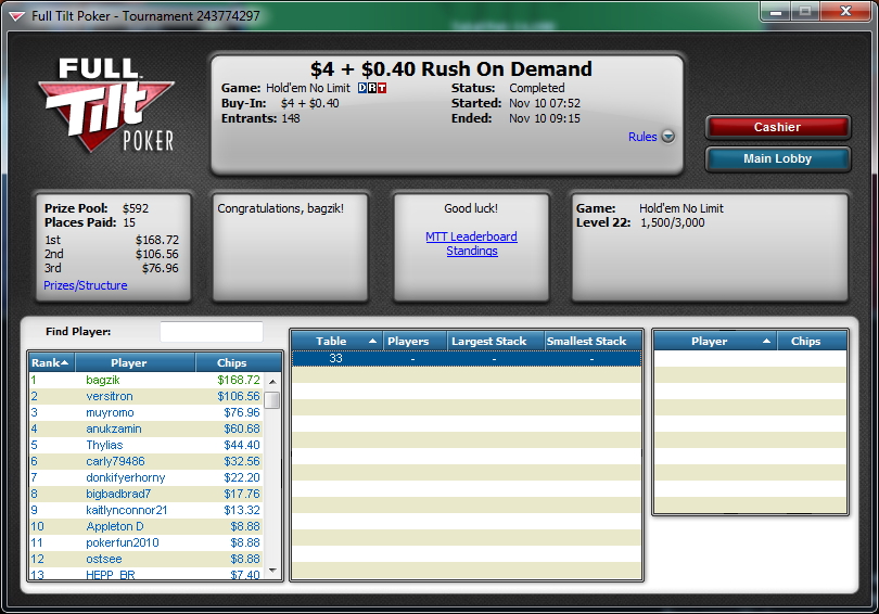 Full Tilt Poker $4 + $0.40 Rush On Demand No Limit Hold'em Tournament - t2000/t4000 Blinds + t500 - 5 players - View hand 1989557