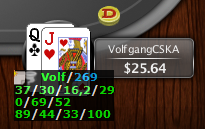 Несмотря на дикую запару днем,сейчас сумел отыграть запланированные 1К рук... Опять слегка недодало, но в паре ситуаций и очень повезло. Так что жаловаться грех в такой ситуации. Сегодня сильно затаитился и отыграл 32/25...Ибо не на 100% готовности чувствовал себя... И еще вот такой вопрос - вроде набил Силвертсар,а когда играю не вижу у себя на эмблеме этого статуса...тупо нет положенных трех звезд. Это означает что их нет или что просто игрок не может видеть сам свой статус? Пару раздачек из сессии...Надеюсь хоть в этот раз мне скажут, где хорошо сыграно, а где плохо.. Не повезло парню$0.05/$0.10 No Limit Holdem PokerStars 6 Players Hand Conversion Powered by weaktight.com Stacks: UTG dragon-scils ($19.66) 197bb UTG+1 barut8787 ( $14.60) 146bb CO Nehen250 ( $7.81) 78bb BTN VladyCSKA ($21.58) 216bb SB traktoryst ( $13.52) 135bb BB chamster20 ($10.90) 109bb Pre-Flop: ( $0.15, 6 players) VladyCSKA is BTN Q  9 dragon-scils calls $0.10, 2 folds, VladyCSKA calls $0.10, 1 fold, chamster20 checks Flop: 4  7  6  ( $0.35, 3 players) chamster20 checks, dragon-scils checks, VladyCSKA checks Turn: A  ( $0.35, 3 players) chamster20 checks, dragon-scils bets $0.10, VladyCSKA calls $0.10, chamster20 raises to $0.40, dragon-scils calls $0.30, VladyCSKA calls $0.30 River: 8  ( $1.55, 3 players) chamster20 checks, dragon-scils bets $1.30, VladyCSKA raises to $5.40, chamster20 folds, dragon-scils calls $4.10 Final Pot: $12.35 VladyCSKA shows a flush, Ace high Q  9 dragon-scils shows 2  10 VladyCSKA wins $11.79 (net + $5.89) chamster20 lost $0.50 dragon-scils lost $5.90 А тут меня заставили понервничать...Решил коллить терн так как мало карт из диапозона соперника попадали в такой борд...К тому же это была не первая попытка защитить блайнды от этого игрока$0.05/$0.10 No Limit Holdem PokerStars 6 Players Hand Conversion Powered by weaktight.com Stacks: UTG tempos333 ( $10.60) 106bb UTG+1 Suhoff76 ( $5) 50bb CO derwisz ( $8.71) 87bb BTN VladyCSKA ($34.31) 343bb SB slindqvist ( $5.05) 51bb BB Mrdeadlift91 ($14.55) 146bb Pre-Flop: ( $0.15, 6 players) VladyCSKA is BTN 7  A 3 folds, VladyCSKA raises to $0.25, 1 fold, Mrdeadlift91 raises to $0.80, VladyCSKA calls $0.55 Flop: 2  9  7  ( $1.65, 2 players) Mrdeadlift91 bets $1.20, VladyCSKA calls $1.20 Turn: 9  ( $4.05, 2 players) Mrdeadlift91 checks, VladyCSKA bets $1.70, Mrdeadlift91 raises to $3.40, VladyCSKA calls $1.70 River: 3  ( $10.85, 2 players) Mrdeadlift91 checks, VladyCSKA checks Final Pot: $10.85 VladyCSKA shows two pair, Nines and Sevens 7  A Mrdeadlift91 shows a pair of Nines A  J VladyCSKA wins $10.36 (net + $4.96) Mrdeadlift91 lost $5.40 Генадий в своем репертуаре...Сначала заставил вскрикнуть от счастья,затем от боли...$0.05/$0.10 No Limit Holdem PokerStars 6 Players Hand Conversion Powered by weaktight.com Stacks: UTG asha1566 ( $4.55) 46bb UTG+1 RensOne ( $18.43) 184bb CO xENilolGE ( $11.14) 111bb BTN VladyCSKA ($36.20) 362bb SB spiner1986 ($8) 80bb BB m213tai ($8.35) 84bb Pre-Flop: ( $0.15, 6 players) VladyCSKA is BTN Q  K 3 folds, VladyCSKA raises to $0.25, spiner1986 calls $0.20, m213tai raises to $1, VladyCSKA calls $0.75, spiner1986 calls $0.75 Flop: J  7  9  ( $3, 3 players) spiner1986 checks, m213tai bets $1.20, VladyCSKA calls $1.20, spiner1986 goes all-in $7, m213tai goes all-in $7.35, VladyCSKA calls $6.15 Turn: 6  ( $24.70, 3 players, 2 all-in) River: 6  ( $24.70, 3 players, 2 all-in) Final Pot: $24.70 VladyCSKA shows a flush, King high Q  K spiner1986 shows two pair, Jacks and Nines J  9 m213tai shows a full house, Jacks full of Sixes J  J m213tai wins $23.59 (net + $15.24) VladyCSKA collects $0.00 (net - $8.35) spiner1986 lost $8 Вот за такие раздачи я и люблю покер... Адреналин зашкаливает, пульс учащается... В такие моменты я обожаю эту игру...$0.05/$0.10 No Limit Holdem PokerStars 6 Players Hand Conversion Powered by weaktight.com Stacks: UTG gorbatchas84 ( $14.22) 142bb UTG+1 fabka42 ( $5.93) 59bb CO Zakera ( $17.46) 175bb BTN traktoryst ($29.80) 298bb SB VladyCSKA ($28.61) 286bb BB Piqzer ( $13.64) 136bb Pre-Flop: ( $0.15, 6 players) VladyCSKA is SB 2  2 3 folds, traktoryst raises to $0.35, VladyCSKA calls $0.30, 1 fold Flop: K  A  Q  ( $0.80, 2 players) VladyCSKA checks, traktoryst bets $0.60, VladyCSKA raises to $1.20, traktoryst calls $0.60 Turn: 8  ( $3.20, 2 players) VladyCSKA bets $1.40, traktoryst calls $1.40 River: 10  ( $6, 2 players) VladyCSKA bets $4.05, traktoryst folds Final Pot: $6.00 VladyCSKA wins $9.78 (net + $2.78) traktoryst lost $2.95 Банк мизерный, но всегда приятно вот так отскочить Гребанные SSSники будут наказаны! Если не мной, то Генадием...$0.05/$0.10 No Limit Holdem PokerStars 6 Players Hand Conversion Powered by weaktight.com Stacks: UTG xxx777118 ($3.03) 30bb UTG+1 Dyszka90 ( $10.40) 104bb CO Allex404 ( $9.41) 94bb BTN Fassi01 ( $21.43) 214bb SB GlenRaven ( $11.70) 117bb BB VladyCSKA ($14.55) 146bb Pre-Flop: ( $0.15, 6 players) VladyCSKA is BB 3  4 xxx777118 calls $0.10, 4 folds, VladyCSKA checks Flop: J  3  3  ( $0.25, 2 players) VladyCSKA checks, xxx777118 bets $0.10, VladyCSKA raises to $0.30, xxx777118 raises to $1, VladyCSKA goes all-in $14.45, xxx77