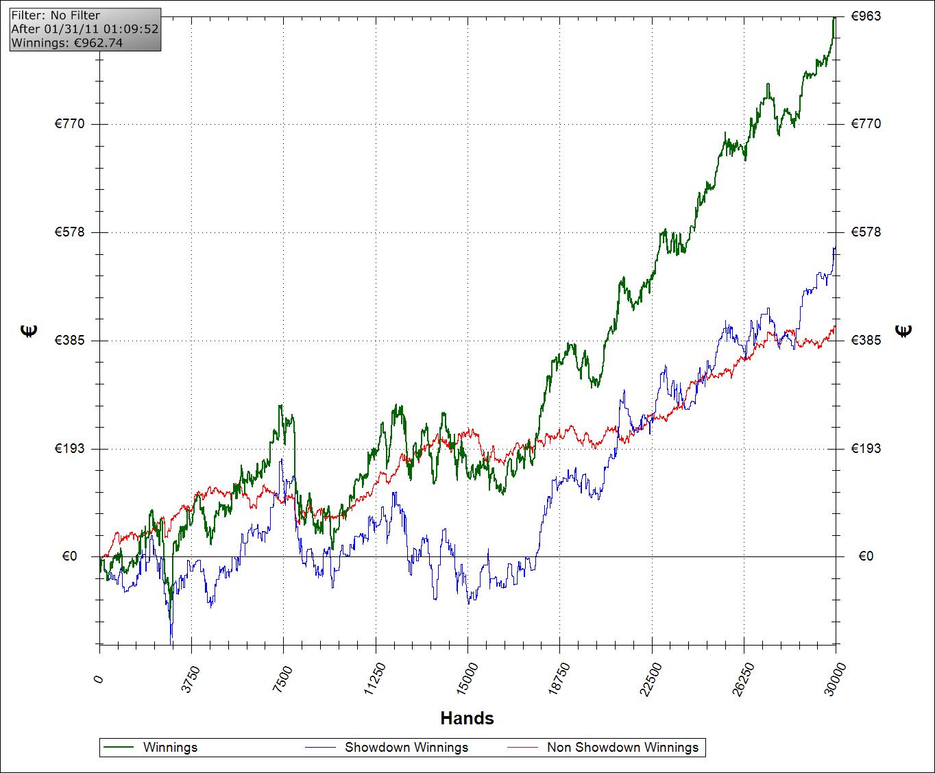 Эй, притормози-ка, парень! Какие к чертям собачьим промежуточные итоги - не смеши?! Это ВСЕГО ЛИШЬ 30k рук! У тебя перебор по EV 360 евро! "16BB/100" - о-о-очень круто, но пойми, такого винрейта не бывает на сколь-нибудь приличной дисстанции, - разве что во сне! Не хочу тебя разочаровывать, но у тебя просто ап. Так что, мальчик, спустись-ка ты на землю и спокойненько продолжай работать над игрой, одновременно наигрывая дисстанцию.