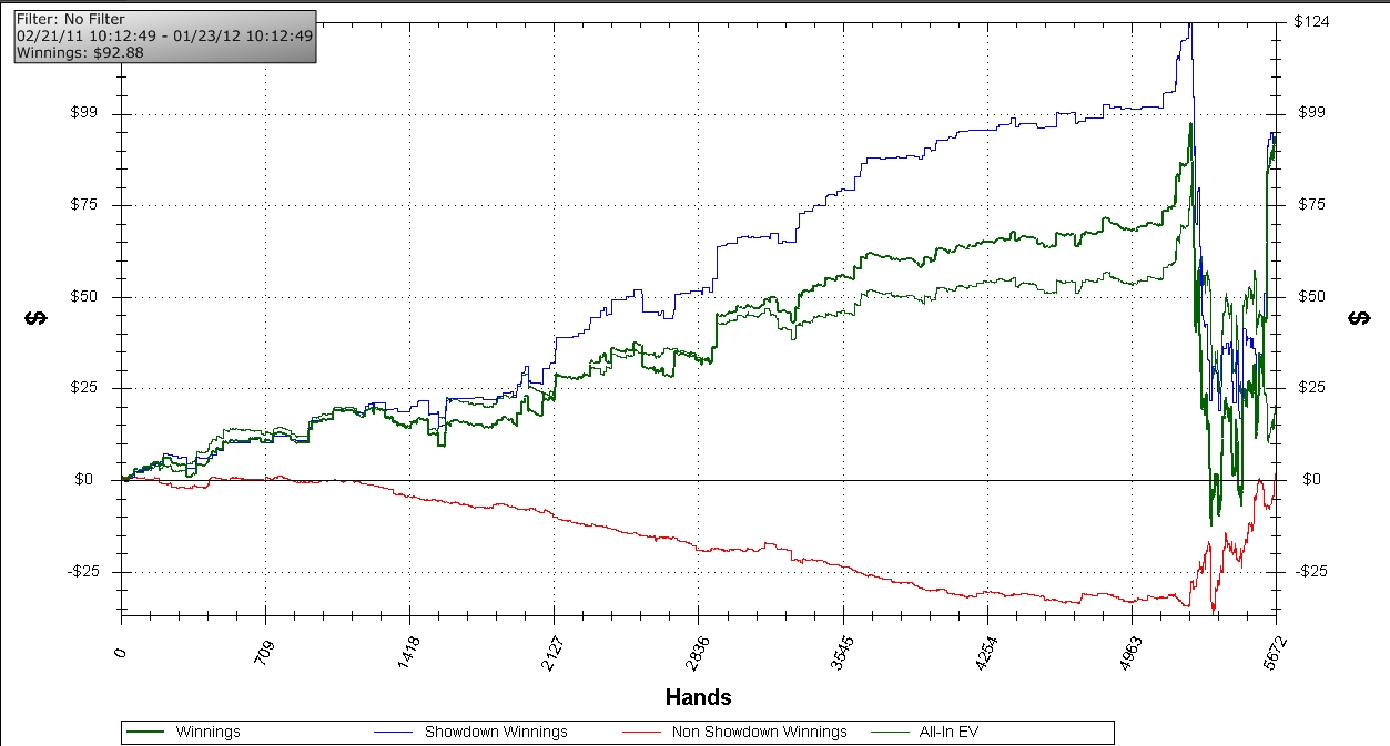 Начали закрадываться мысли,что все слишком хорошо,и скоро нагрянет даун. Хотя и дистанции то нет,но все же. Игрой доволен,правда в конце начал совершать ошибки. Говорил же себе,что надо играть строго по карте,блефовать в телефонов слишком дорого,но нет блин,не обошлось и без этого. Последнюю 1к рук очень часто заходили мелкие карманки,с которыми заходил на сет,но не попадал. Правда вчера попадал чаще,чем должен был,так что все норм. 1. Думал опп сделает скидку на мою тайтовость,но не проканало. Ладно бы по тузу вскрыл,но по К. Опять таки,не стоит блефовать в телефонов. $0.02/$0.04 No Limit Holdem Entraction 5 Players Hand Conversion Powered by weaktight.com Stacks: UTG ($1.75) CO ($1.70) BTN ($0.85) SB ($5.81) Hero ($4) Pre-Flop: ($0.06, 5 players) Hero is BB 2 2![]() 3 folds, SB raises to $0.12, Hero calls $0.08 Flop: 7 7 6 ($0.24, 2 players)SB bets $0.24, Hero raises to $0.48, SB calls $0.24 Turn: 5 ($1.20, 2 players)SB checks, Hero bets $0.60, SB calls $0.60 River: 6 ($2.40, 2 players)SB checks, Hero bets $1.80, SB calls $1.80 Final Pot: $6 SB shows 4 K![]() Hero shows 2 2![]() SB wins $5.70 (net +$2.70) Hero lost $3 2. Тут претензии только к себе,оч плохо сыграл $0.02/$0.04 No Limit Holdem HoldemManager 6 Players Hand Conversion Powered by weaktight.com Stacks: UTG ($4) UTG+1 ($4.35) Hero ($4) BTN ($2.44) SB ($5.81) BB ($4) Pre-Flop: ($0.06, 6 players) Hero is CO Q J![]() 2 folds, Hero raises to $0.11, BTN calls $0.11, 2 folds Flop: 2 7 2 ($0.28, 2 players)Hero bets $0.21, BTN calls $0.21 Turn: 3 ($0.70, 2 players)Hero bets $0.35, BTN calls $0.35 River: 9 ($1.40, 2 players)Hero bets $1.80, BTN goes all-in $1.77 Final Pot: $4.97 Hero shows Q J![]() BTN shows 6 7![]() BTN wins $4.70 (net +$2.26) Hero collects $0.03 (net -$2.44) 3. Чуйка или ссаный нит? =) Опп с KQs играл весьма с адекватными статами. Я решил что позади,на терне был не прав,но в итоге да. И нет желания выставляться с ТПТК против двоих. $0.02/$0.04 No Limit Holdem HoldemManager 4 Players Hand Conversion Powered by weaktight.com Stacks: Hero ($9.74) BTN ($9.01) SB ($1.17) BB ($4) Pre-Flop: ($0.06, 4 players) Hero is CO A K![]() Hero raises to $0.11, BTN calls $0.11, 1 fold, BB calls $0.07 Flop: 10 K 9 ($0.35, 3 players)BB bets $0.26, Hero calls $0.26, BTN calls $0.26 Turn: 6 ($1.13, 3 players)BB bets $0.56, Hero folds, BTN calls $0.56 River: 5 ($2.25, 2 players)BB bets $1.12, BTN raises to $2.52, BB goes all-in $3.07, BTN calls $0.55 Final Pot: $8.39 BB shows K Q![]() BTN shows J 10![]() BB wins $7.98 (net +$3.98) BTN collects $0.00 (net -$4.00) Hero lost $0.37 4. В конце надоело тайтиться. $0.02/$0.04 No Limit Holdem HoldemManager 6 Players Hand Conversion Powered by weaktight.com Stacks: UTG ($9.88) UTG+1 ($4) CO ($2.13) BTN ($0.70) SB ($11.18) Hero ($4.65) Pre-Flop: ($0.06, 6 players) Hero is BB 8 K![]() 4 folds, SB raises to $0.12, Hero raises to $0.36, SB calls $0.24 Flop: 5 7 7 ($0.72, 2 players)SB bets $0.36, Hero raises to $1.44, SB folds Final Pot: $2.52 Hero shows 8 K![]() Hero wins $2.45 (net +$0.65) SB lost $0.72 $0.02/$0.04 No Limit Holdem Entraction 5 Players Hand Conversion Powered by weaktight.com Stacks: UTG ($4.22) CO ($4.60) BTN ($0.55) Hero ($5.48) BB ($4) Pre-Flop: ($0.06, 5 players) Hero is SB K Q![]() 3 folds, Hero raises to $0.10, BB raises to $0.30, Hero calls $0.20 Flop: A 7 9 ($0.60, 2 players)Hero checks, BB bets $0.45, Hero raises to $1.20, BB folds Final Pot: $2.25 Hero wins $2.18 (net +$0.68) BB lost $0.75 5. Приятная раздача =) до этого на скайп звонил друг,и я отключил звук. как оказалось зря. Клево видеть такой флоп =) $0.02/$0.04 No Limit Holdem HoldemManager 6 Players Hand Conversion Powered by weaktight.com Stacks: UTG ($5) UTG+1 ($3.90) CO ($7.01) BTN ($4) Hero ($4.40) BB ($4) Pre-Flop: ($0.06, 6 players) Hero is SB K K![]() 1 fold, UTG+1 raises to $0.14, CO calls $0.14, 1 fold, Hero folds, 1 fold Flop: 8 K 8 ($0.34, 2 players)UTG+1 bets $0.17, CO raises to $0.34, UTG+1 calls $0.17 Turn: 10 ($1.02, 2 players)UTG+1 checks, CO bets $0.20, UTG+1 calls $0.20 River: 4 ($1.42, 2 players)UTG+1 checks, CO checks Final Pot: $1.42 UTG+1 shows 3 3![]() CO shows 9 J![]() UTG+1 wins $1.35 (net +$0.67) CO lost $0.68 Пока все отлично,посмотрим что будет дальше,как я пройду испытание дауном. Сегодня пойду к отцу на юбилей. Честно говоря не хочется. Родители развелись 7 лет назад,и я мало с ним общаюсь,но он все таки отец. The World Is Yours