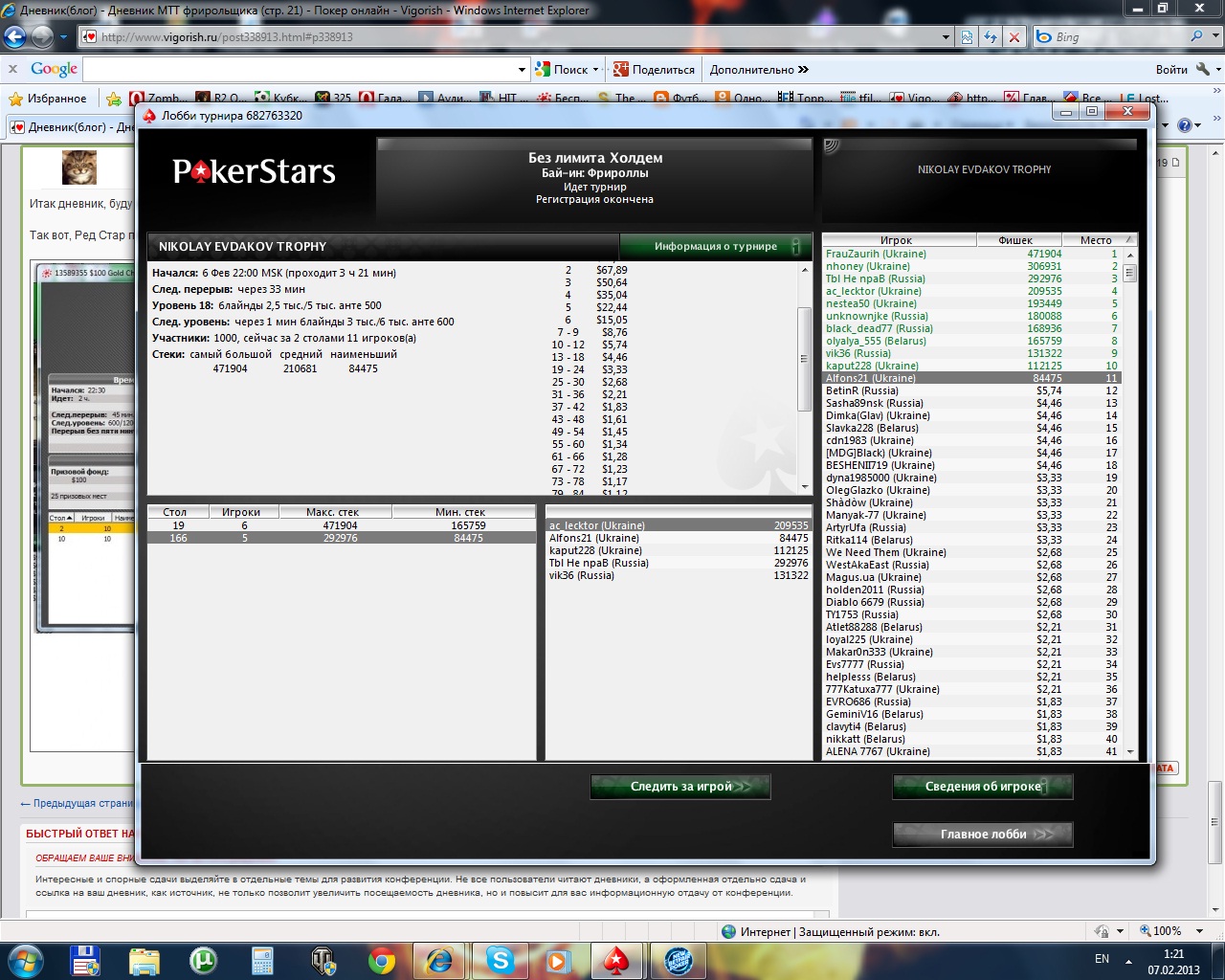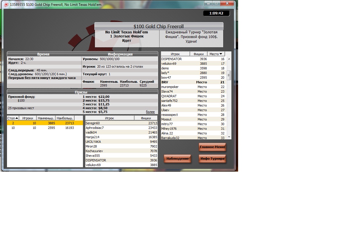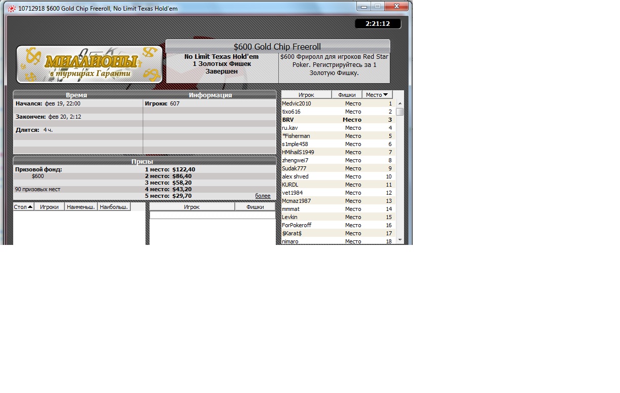 Так вот, Ред Стар покер, турнир за золотую фишку, место 21е выгрыш 1,2$