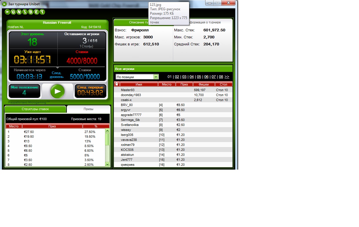 Вот результат, на финалке кокретно не везло ни одного Алл ина не взял, хотя в большинстве был впереди, зашёл на финалку 4-м ушёл 8-м(( печалька , но я в плюсе 18,16 Долларов Выгрыш :cool: