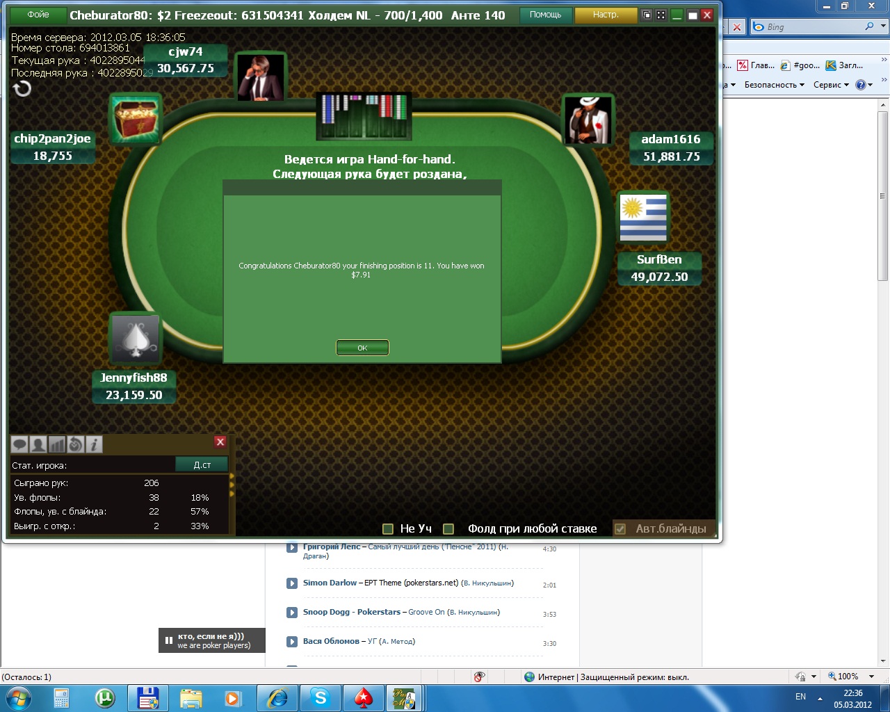 Ну как и обещал , выгрыш больше доллара, немног оне дотянул до финалки , очень обидно проиграл с карманными ВВ против 66, оппу на флоп 6 и я 11-й :(