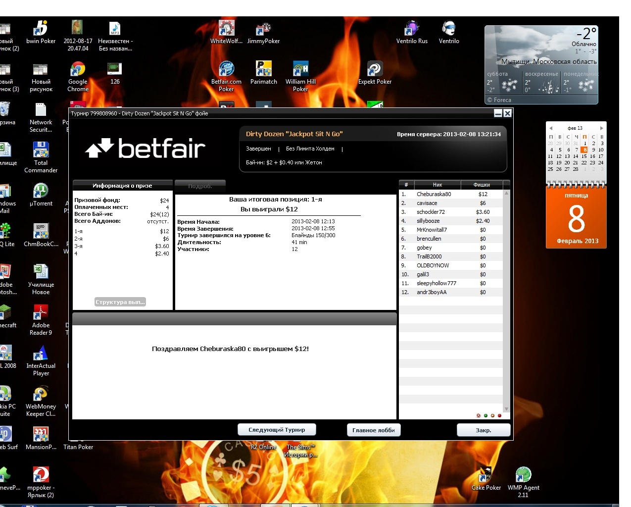 И на последок , случайно , правда СЛУЧАЙНО, зарегался в сит эн го турнир Грязная дюжина за 2,4 $ 12 человек... ну и вот результат