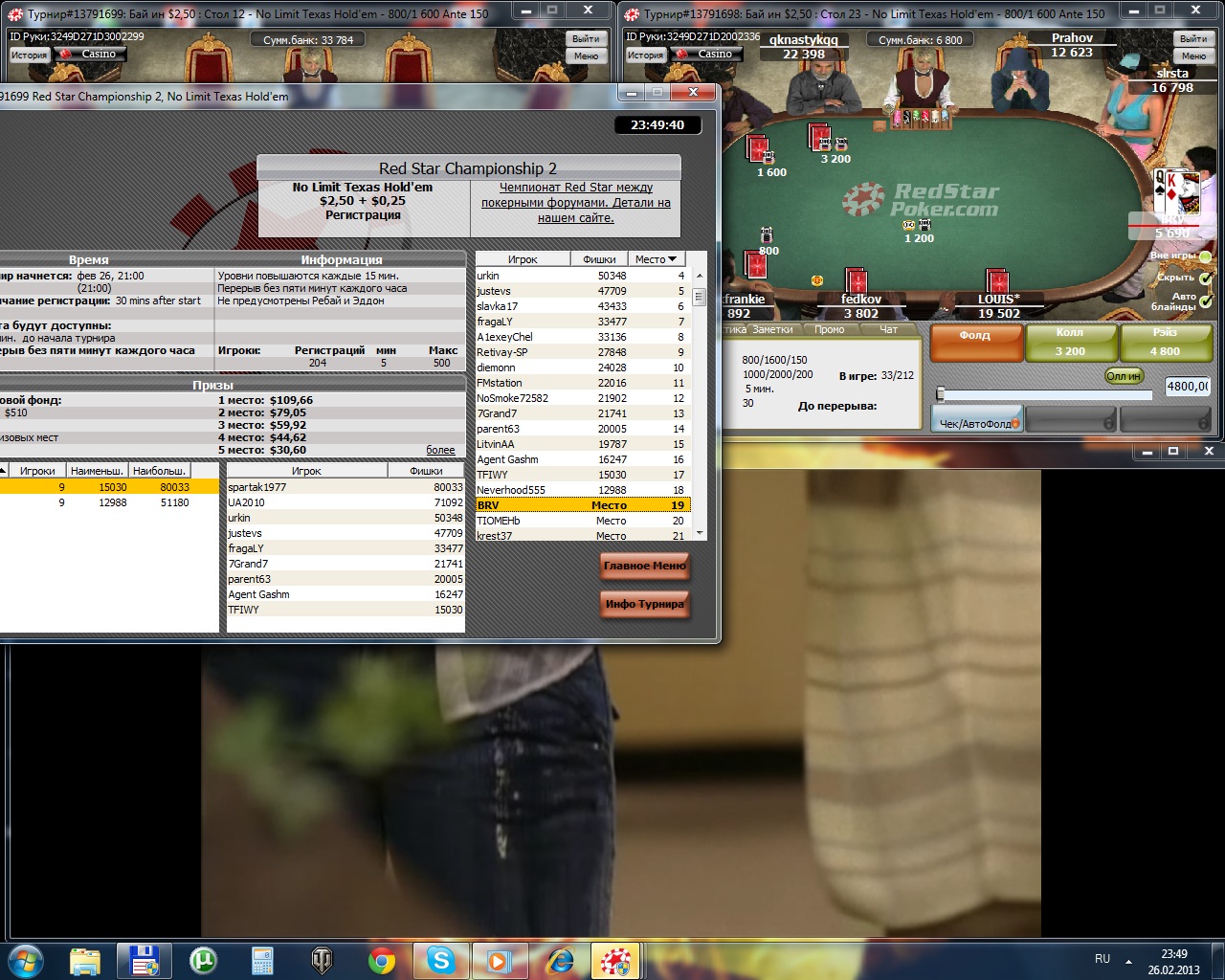 -Играю за Вигориш на чемпионате 90-й и 105-й в турнирах, в деньгам оба, но минус 2 доллара))