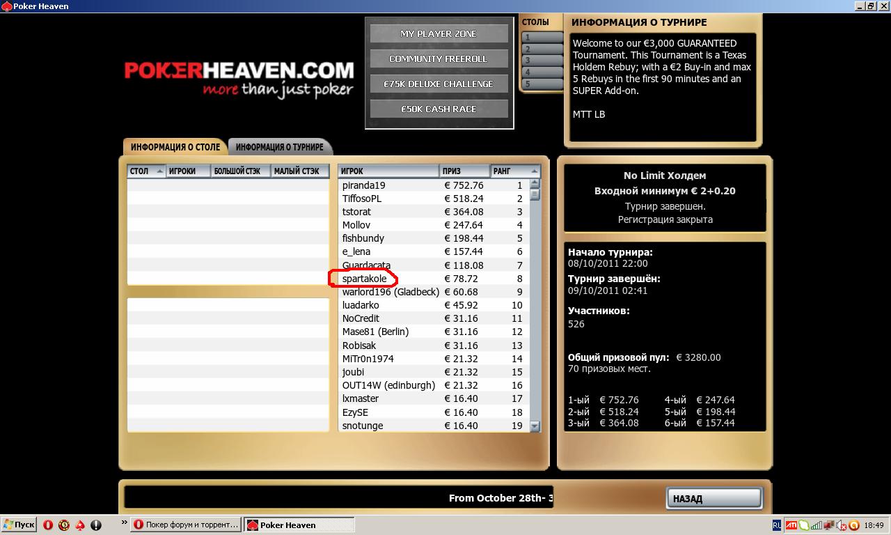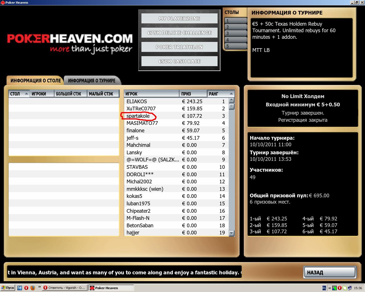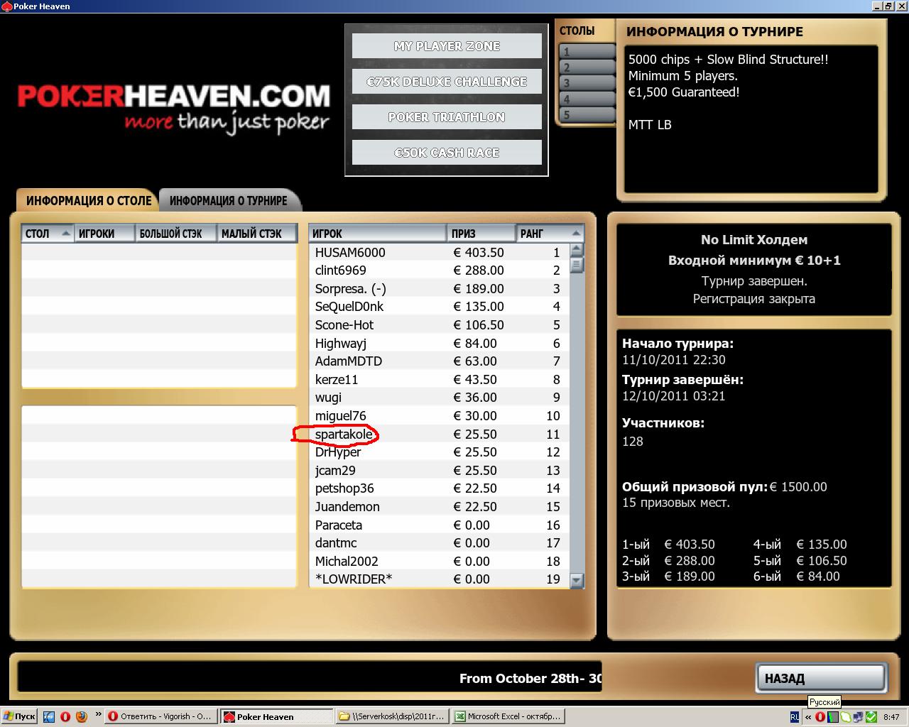 Игра PokerStars #68870281708: Турнир №453899287, $3.19+$0.31 USD Холдем Безлимитный - уровень IX (200/400) - 12.10.2011 22:49:22 MSK 12.10.2011 14:49:22 ВВ