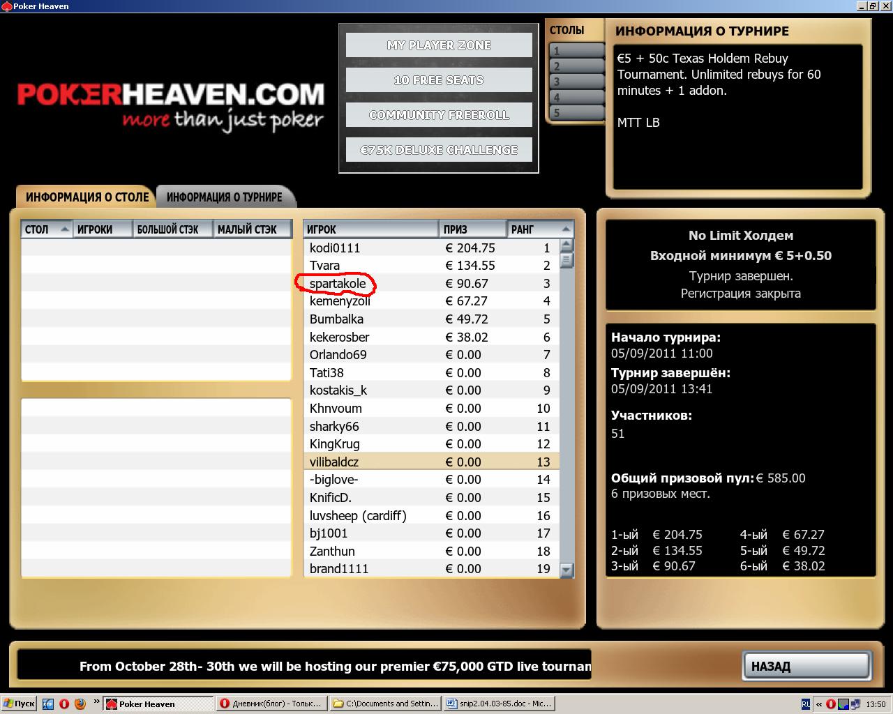 Хочу реанимировать данный дневничек...точнее уже реанимировал , так как хочу поставить перед собой кое какие цели ...точнее уже поставил Обо всем по порядку... После краха ФТП я, как уже писал, осел в сети Боссмедиа. Послонявшись по различным румам данной сети и порядком подистрепав банкролл, я задепил последние 100евро в рум PokerHeaven и начал играть МТТшки за 1-3 евро. Играл не много, максимум 3-4 турнира в день...ну собственно как играл с тех пор смотри в спойлере самый большой заносик Последнее время играть стал как то расхлябано...короче по рыбному . И поэтому решил немного подстегнуться с помощью дневника он хороший, думаю не откажется мне помочь Ну и цель - достичь профита 10000 евро к новому году Играть буду конкретные турниры: 500 Guaranteed Rebuy за 5+0,50 евро - в 11.00 МСК. 8000 Guaranteed за 5+0,50 евро - в 22.00 МСК. 5000 Guaranteed за 2+0,20 евро - в 22.00 МСК. 2000 Guaranteed Deepstack за 10+1 евро - в 22.30 МСК. это основные...ну может еще чего походу буду подключать Результаты буду выкладывать, а вот с раздачами хуже...статистики в боссмедии я не нашел, а программами которые записывают раздачи я не пользуюсь. Ну да ладно...как нибудь выкручусь Посмотрим, что из этого выйдет ![]() - А этот пацак вообще думает на языках, продолжения которых не знает! (с) "Кин-дза-дза"