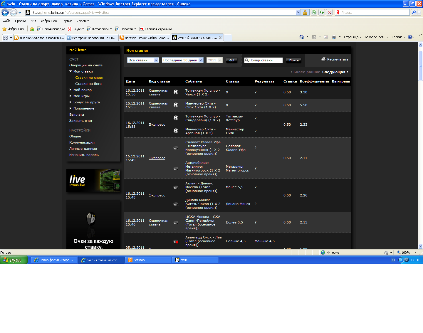 Владимир,обрати внимание:сыграли первые ставки.Почти все.А последние вообще не играют.Хорошо,что хоть в плюс вышел.Вчера вечером залез посмотреть результаты и офигел-у тебя играли 2 или 3 ставки из 6-ти.Я имею ввиду "топ-чемпионаты" :) .