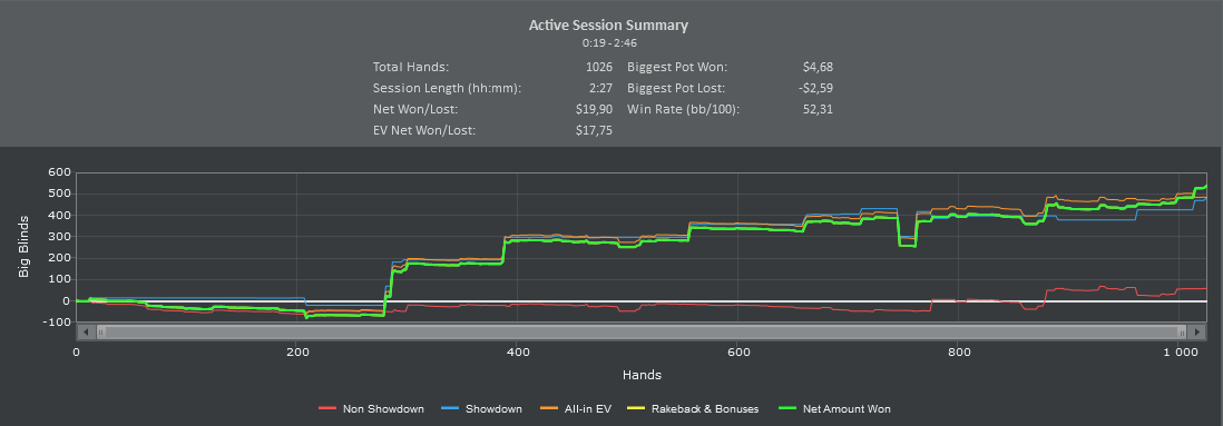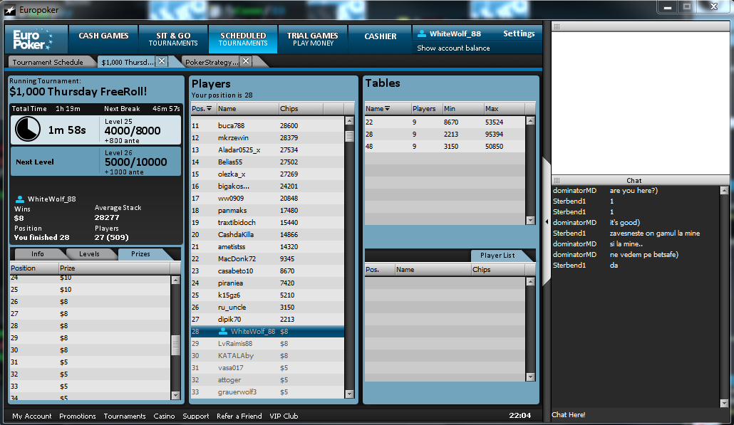 Отыграл также 2 фриролла и 1 турнир c вступительным взносом в $1 с офигительным :)) оверлеем в $300 на Betsson-е, 1 фриролл на Titan-e и 1 в EuroPoker-е - ничего не выиграл.