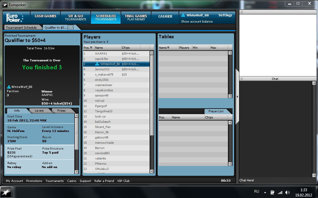 Потом начался Gambler Freeroll. Стеки по 1к. Блайнды по 5 минут с уровня 10/20. Вначале не удалось набить стек :( , удалось исполнить пару стилов. Но... Вылетел я довольно быстро:
