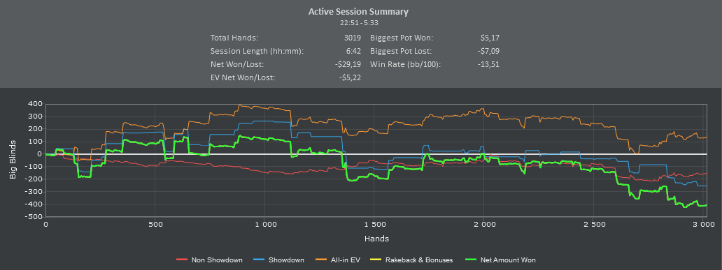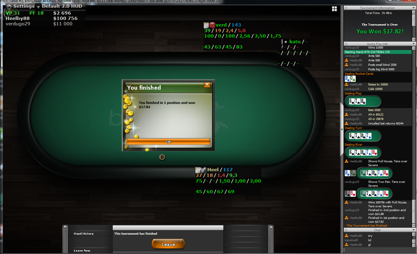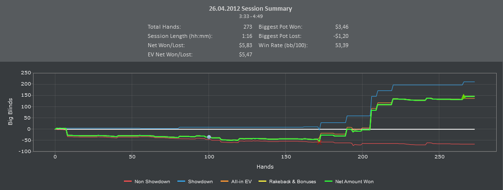 ! Бл-е-а-т-ь! Да пошло оно всё! Докрутил до "0". .банный Халк! Каким-то чудом со степов поимел билет $10+1, но чуда не произошло - во втором часу с кнопки пушнул эни-ту в малый блайнд (большой был в сит-ауте), так этот человек меня видно прощёлкал и принял, на К8s. А были равные стеки, по 12М, что-ли. На какой он меня диапазон клал, х.з. Я его потом пробил, так у него на 13 турниров +$300... Итого здесь