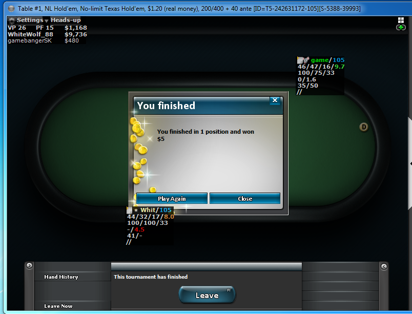 Играть стало сложнее. Все учатся. Все хотят выиграть. Просто так даже на НЛ2 уже не отберёшь денежку :) . Волею судьбы опять вернулся во "фрирольное рабство" :)) . С банкроллом в 50$. Что снял, что проиграл. Но по любому май месяц у меня был лучшим в карьере.