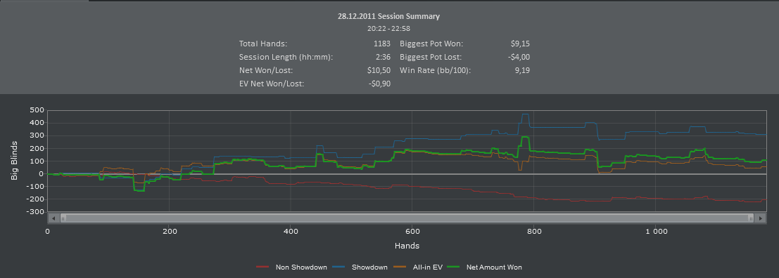 .Раздача, где мне очень сильно повезло. Попросту говоря, доехало !Итак - раздача дня! Тагил рулит! Разруливает Тагил! $0.05/$0.10 No Limit Holdem OnGame 8 Players Hand Conversion Powered by weaktight.com Stacks: UTG HelluvaR1de ($17.16) UTG+1 paulo1969 ($3.83) MP1 GUERRERON01 ($8.14) MP2 User ($11.92) CO Cliff0rd2015 ($10.45) BTN dieter86 x ($10.01) SB mr.pak ($10.67) BB lkasjlkfj ($13.86) Pre-Flop: ($0.15, 8 players) User is MP2 10 J![]() 1 fold, paulo1969 calls $0.10, GUERRERON01 raises to $0.25, User calls $0.25, 1 fold, dieter86 x raises to $1.25, 2 folds, paulo1969 folds, GUERRERON01 folds, User calls $1 Flop: 8 2 8 ($3, 2 players)User checks, dieter86 x bets $2.25, User calls $2.25 Turn: 3 ($7.50, 2 players)User checks, dieter86 x goes all-in $6.51, User calls $6.51 River: K ($20.52, 2 players, 1 all-in)Final Pot: $20.52 User shows FLUSH KING 10 J![]() dieter86 x shows TWO_PAIR ACE, EIGHT A A![]() User wins $19.16 (net +$9.15) paulo1969 lost $0.10 GUERRERON01 lost $0.25 dieter86 x lost $10.01 Да понимаю, кто здесь был , но не мог выпустить оппонента со статами 54/24. Вы уж простите .А вообще - кто что думает? Советуем. Не стесняемся. Буду благодарен. ![]() И последняя на сегодня сессия на Party Poker: Разобрался с конвертацией .Последний раз редактировалось KonAs 30 дек 2011, 03:47, всего редактировалось 2 раз(а).