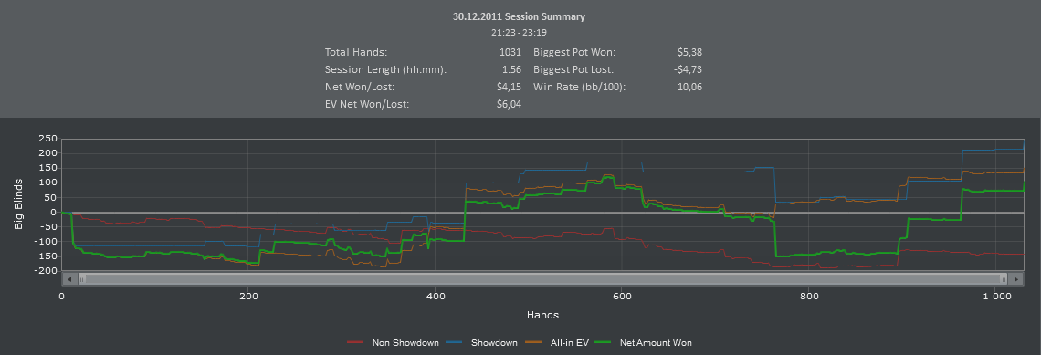 ).Раздача "Со всей пролетарской ненавистью" (или "Тиграм таки додали мяса "):$0.01/$0.02 No Limit Holdem 6 Players Hand Conversion Powered by weaktight.com Stacks: UTG ($2.40) UTG+1 ($1.21) (CO) ($2.89) BTN ($2.19) SB ($3.04) BB ($2) Pre-Flop: ($0.03, 6 players) Hero (он же ) is CO Q Q![]() 1 fold, UTG+1 calls $0.02, raises to $0.12, 3 folds, UTG+1 raises to $0.30, calls $0.18Flop: K 9 K ($0.63, 2 players)UTG+1 bets $0.45, Hero calls $0.45 Turn: J ($1.53, 2 players)UTG+1 goes all-in $0.46, calls $0.46River: 10 ($2.45, 2 players, 1 all-in)Final Pot: $2.45 showsQ Q![]() UTG+1 shows A A![]() wins $2.33 (net +$1.12)UTG+1 lost $1.21 Я плакал! Its poker, guys! Спать! Последний раз редактировалось KonAs 31 дек 2011, 23:10, всего редактировалось 1 раз.