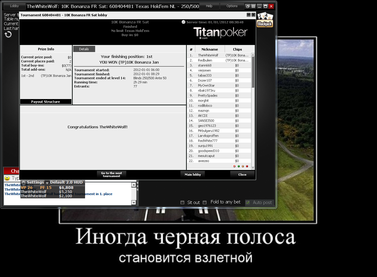 Тиграм в клетке мяса недодают! Почти 2 стека!Раздача ночи: Какая-ж я - недоставил на тёрне и вмазался на ривере . Или ФЗ?$0.01/$0.02 No Limit Holdem 8 Players Hand Conversion Powered by weaktight.com Stacks: UTG ($2.19) UTG+1 ($2.54) MP1 ($0.76) MP2 ($2) CO ($1.76) BTN ($1.97) SB ($2.30) Hero (BB) ($2.33) Pre-Flop: ($0.03, 8 players) Hero is BB 10 10![]() 5 folds, BTN calls $0.02, SB calls $0.01, Hero raises to $0.08, BTN calls $0.06, SB calls $0.06 Flop: 6 10 Q ($0.24, 3 players)SB checks, Hero bets $0.06, BTN calls $0.06, SB calls $0.06 Turn: 5 ($0.42, 3 players)SB checks, Hero bets $0.14, BTN folds, SB calls $0.14 River: J ($0.70, 2 players)SB checks, Hero bets $0.32, SB raises to $0.64, Hero goes all-in $1.73, SB goes all-in $1.38 Final Pot: $4.77 Hero shows 10 10![]() SB shows A K![]() SB wins $4.51 (net +$2.21) Hero collects $0.03 (net -$2.30) BTN lost $0.14 Последний раз редактировалось KonAs 30 дек 2011, 08:00, всего редактировалось 2 раз(а).