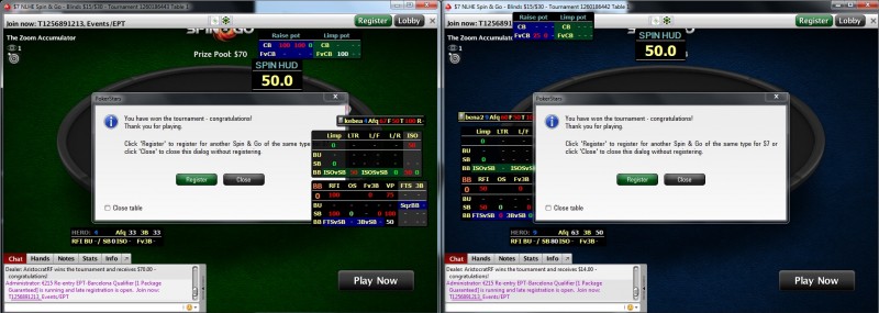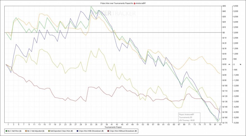 - , а чел предъявляет - ? Да пожалуйста, мы получим своего на тёрне, но опп получит к своему бубновому тузу 3 бубны на флопе, и ещё одну - на ривере На чём хотели сегодня закрывали: так, мои - < - , - < - , карманные - коллировали на - и получали 6-ку по флопу. Вот один из примеров: 1-я рука матча. Чудик думал секунд 15 перед тем, как заколить PokerStars - $6.58+$0.42|10/20 NL (3 max) - Holdem - 3 players Hand converted by PokerTracker 4 BTN: 25 BB Hero (SB): 25 BB BB: 25 BB (VPIP: 0.00, PFR: 0.00, 3Bet Preflop: -, Hands: 1) Hero posts SB 0.5 BB, BB posts BB 1 BB Pre Flop: (pot: 1.5 BB) Hero has J J BTN raises to 3 BB, Hero raises to 25 BB and is all-in, fold, BTN calls 22 BB and is all-in Flop: (51 BB, 2 players) 6 8 K Turn: (51 BB, 2 players) 4 River: (51 BB, 2 players) 8 Hero shows J J (Two Pair, Jacks and Eights)BTN shows K J (Two Pair, Kings and Eights)BTN wins 51 BB Ну да сегодняшние "страшилки" можно долго описывать, но не стоит оно того. Лучше выложу самую "красивую" сегодняшнюю руку PokerStars - $6.58+$0.42|10/20 NL (3 max) - Holdem - 2 players Hand converted by PokerTracker 4 BB: 25.2 BB (VPIP: 62.50, PFR: 0.00, 3Bet Preflop: -, Hands: 9) Hero (SB): 49.8 BB Hero posts SB 0.5 BB, BB posts BB 1 BB Pre Flop: (pot: 1.5 BB) Hero has Q T Hero raises to 2 BB, BB calls 1 BB Flop: (4 BB, 2 players) T T T BB bets 1 BB, Hero calls 1 BB Turn: (6 BB, 2 players) A BB bets 1 BB, Hero calls 1 BB River: (8 BB, 2 players) A BB bets 13 BB, Hero raises to 26 BB, BB calls 8.2 BB and is all-in Hero shows Q T (Four of a Kind, Tens)(Pre 37%, Flop 100%, Turn 100%) BB shows A J (Full House, Aces full of Tens)(Pre 63%, Flop 0%, Turn 0%) Hero wins 50.4 BB Да и вот эта ещё позобавила. Опп - "Платина", и играл не 1 турнир. Что его здесь "переклинило" - непонятно PokerStars - $6.58+$0.42|15/30 NL (3 max) - Holdem - 3 players Hand converted by PokerTracker 4 BTN: 11.67 BB (VPIP: 68.75, PFR: 50.00, 3Bet Preflop: 100.00, Hands: 17) Hero (SB): 9.67 BB BB: 28.67 BB (VPIP: 38.46, PFR: 16.67, 3Bet Preflop: 0.00, Hands: 15) Hero posts SB 0.5 BB, BB posts BB 1 BB Pre Flop: (pot: 1.5 BB) Hero has Q J BTN calls 1 BB, Hero raises to 9.67 BB and is all-in, fold, BTN calls 8.67 BB Flop: (20.33 BB, 2 players) 5 Q Q Turn: (20.33 BB, 2 players) 4 River: (20.33 BB, 2 players) T Hero shows Q J (Three of a Kind, Queens)(Pre 67%, Flop 97%, Turn 82%) BTN shows 2 3 (One Pair, Queens)(Pre 33%, Flop 3%, Turn 18%) Hero wins 20.33 BB В общем, вот сегодняшний график А вот график за месяц - месяц игры с итоговым результатом в "0". ПТ почему-то не видит 5 турниров. Все возможные аудиты импортировал, даже заказал отдельно по почте у Старзов историю рук в текстовом формате и запихнул туда - всё равно не отображает эти 5 штук. Так что на самом деле их 1501, а не 1496, как на картинке |