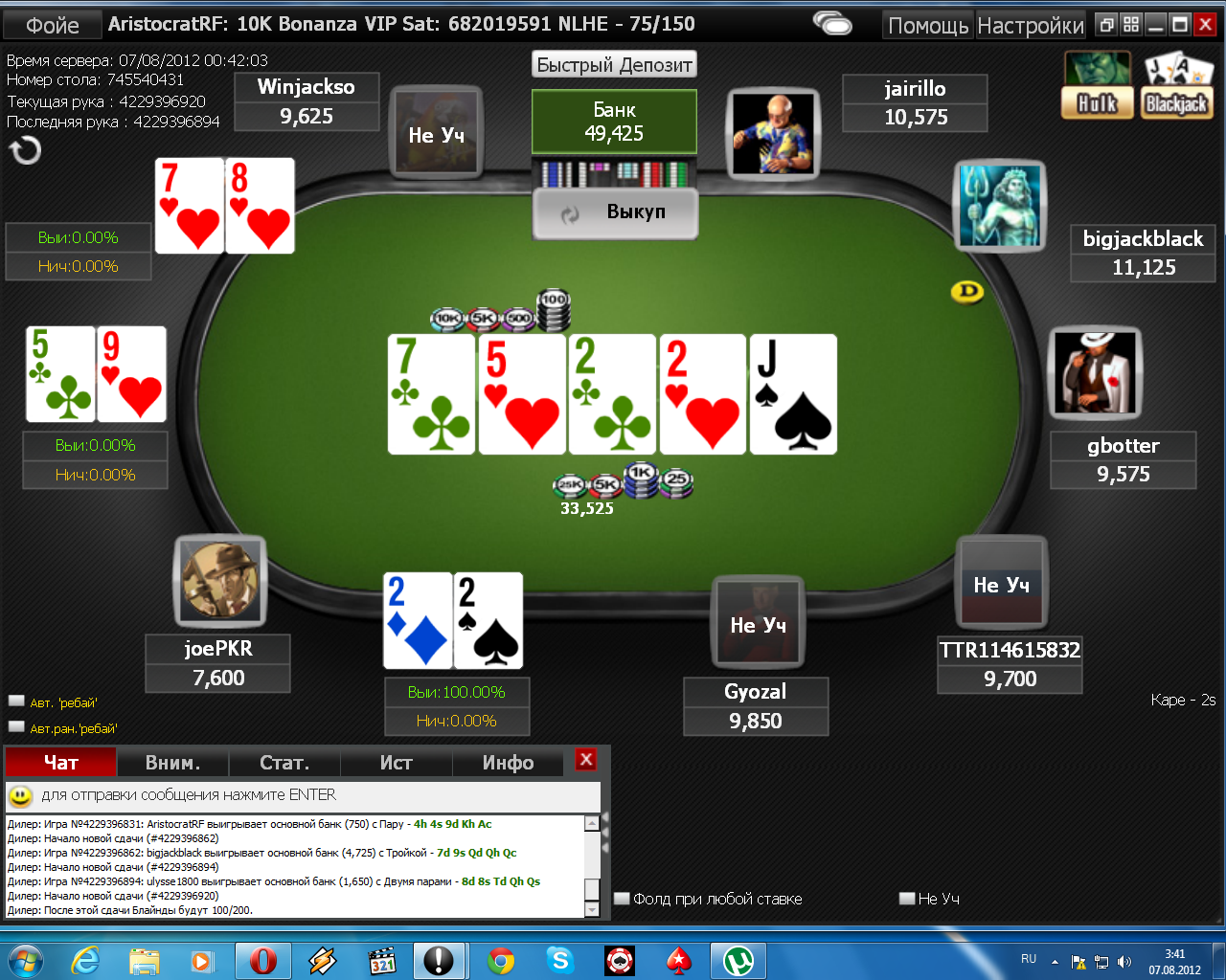 Решил всё таки сыграть ещё один турнир-сателлит к ежемесячному турниру $10 000 Monthly Bonanza, который состоится в последний день августа, дабы заранее обеспечить себя билетиком (их было 10 штук на турнир). Начальные стэки были по 10 000, блайнды 50/100 и уровни по 5 минут. Не прошло и 10 минут, как за стол подсадили лидера, который успел учетвериться к тому времени :paratrooper: Но 2-х подряд сыгрынных с ним рук оказалось достаточно, чтобы отобрать у него всё, и обеспечить себе комфортный стэк :happy: