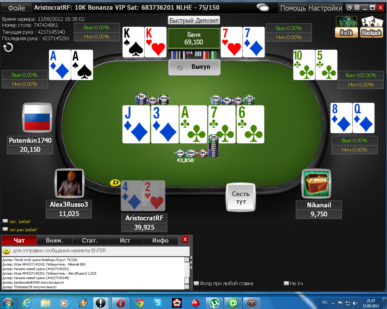 Aristocrate, тоже не сложилось. В префлоп алл-ине мои 88 проиграли AJs. 404-й что-ли. В другой раз занесём))).