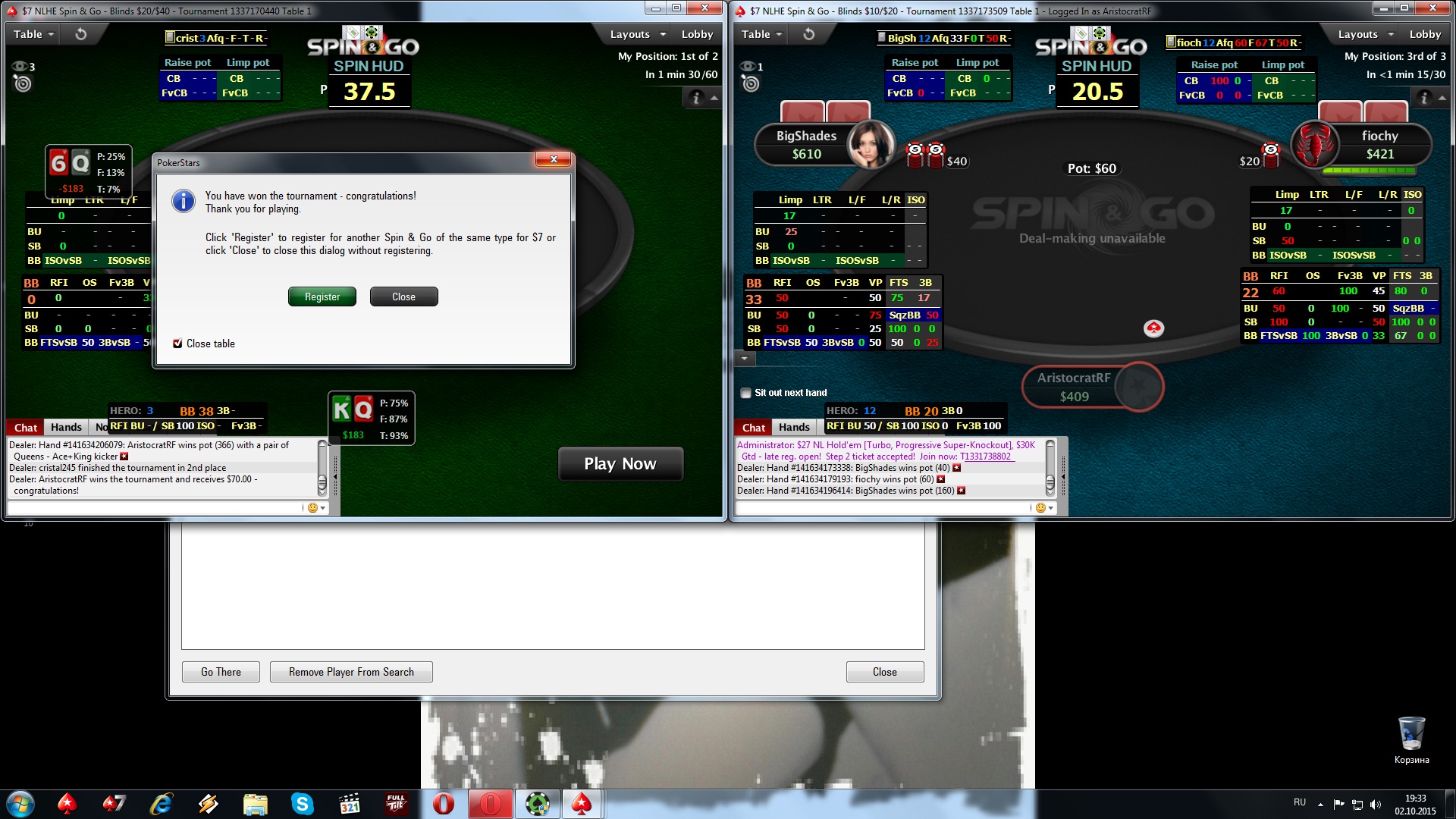 PokerStars - $6.58+$0.42|15/30 NL (3 max) - Holdem - 2 players Hand converted by PokerTracker 4 Hero (SB): 34.53 BB BB: 15.47 BB (VPIP: 41.18, PFR: 35.29, 3Bet Preflop: 0.00, Hands: 17) Hero posts SB 0.5 BB, BB posts BB 1 BB Pre Flop: (pot: 1.5 BB) Hero has 9 A Hero raises to 2 BB, BB raises to 15.47 BB and is all-in, Hero calls 13.47 BB Flop: (30.93 BB, 2 players) J 7 3 Turn: (30.93 BB, 2 players) 2 River: (30.93 BB, 2 players) 9 BB shows 8 T (Straight, Jack High)(Pre 41%, Flop 32%, Turn 20%) Hero shows 9 A (One Pair, Nines)(Pre 59%, Flop 68%, Turn 80%) BB wins 30.93 BB Продолжение матча... ... Опять?!?!? PokerStars - $6.58+$0.42|20/40 NL (3 max) - Holdem - 2 players Hand converted by PokerTracker 4 Hero (BB): 15.43 BB SB: 22.08 BB (VPIP: 43.33, PFR: 40.00, 3Bet Preflop: 18.18, Hands: 32) SB posts SB 0.5 BB, Hero posts BB 1 BB Pre Flop: (pot: 1.5 BB) Hero has 6 A SB raises to 22.08 BB and is all-in, Hero calls 14.43 BB and is all-in Flop: (30.85 BB, 2 players) 4 6 J Turn: (30.85 BB, 2 players) A River: (30.85 BB, 2 players) 5 Hero shows 6 A (Two Pair, Aces and Sixes)(Pre 52%, Flop 69%, Turn 100%) SB shows T 9 (High Card, Ace)(Pre 48%, Flop 31%, Turn 0%) Hero wins 30.85 BB |