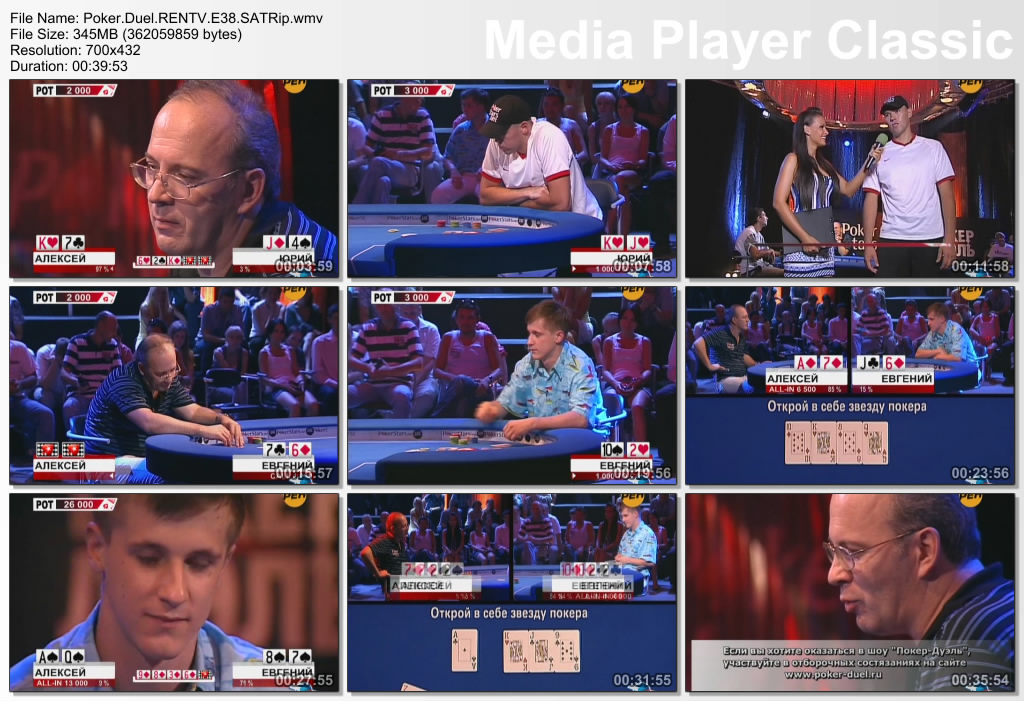 Видео: Windows Media Video 9 700x432 25.00fps 1070Kbps Аудио: Windows Media Audio 44100Hz stereo 128Kbps Длительность: 00:39:53 Сайт проекта - http://poker-duel.ru/