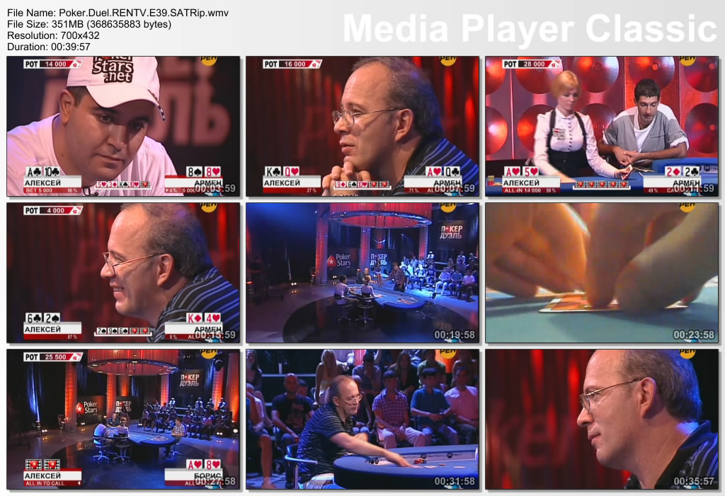 Видео: Windows Media Video 9 700x432 25.00fps 1090Kbps Аудио: Windows Media Audio 44100Hz stereo 128Kbps Длительность: 00:39:57 Сайт проекта - http://poker-duel.ru/