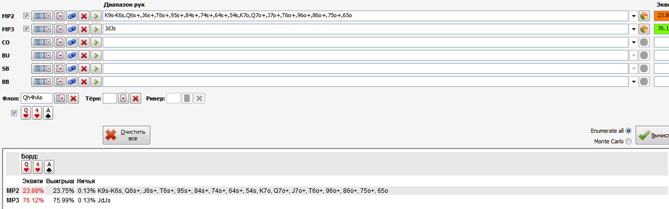 Я вбил в калькулятор вот такой спектр, предполагаемо опп чаще всего сыграет лимп и колл рейза вот с таким спектром, в котором средние руки+ немного слегка мусороватых рук, на самом деле спектр оппа может быть ещё шире:А теперь вбиваю нашу руку, а также флоп и смотрю эквити против спектра, и оно тут просто фантастически огромное 76% ! :Соответственно это тот случай, когда я не особо боюсь доехавшего флешдро или дамы.