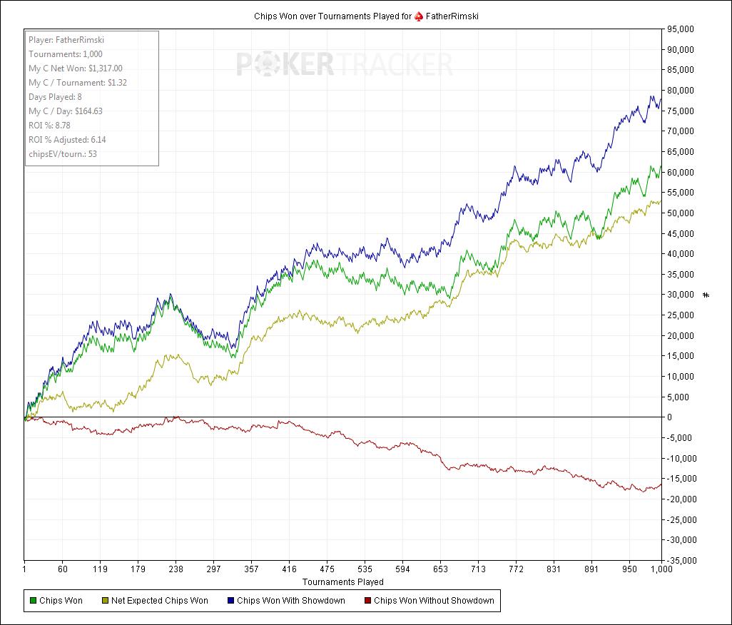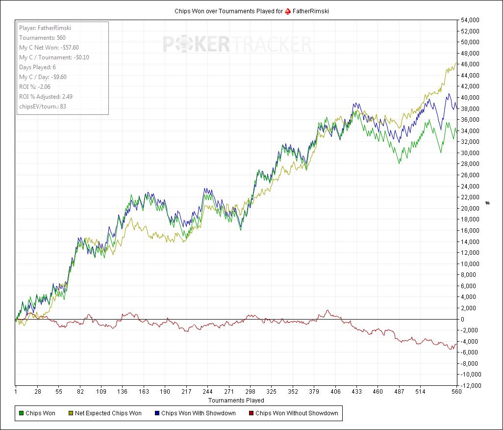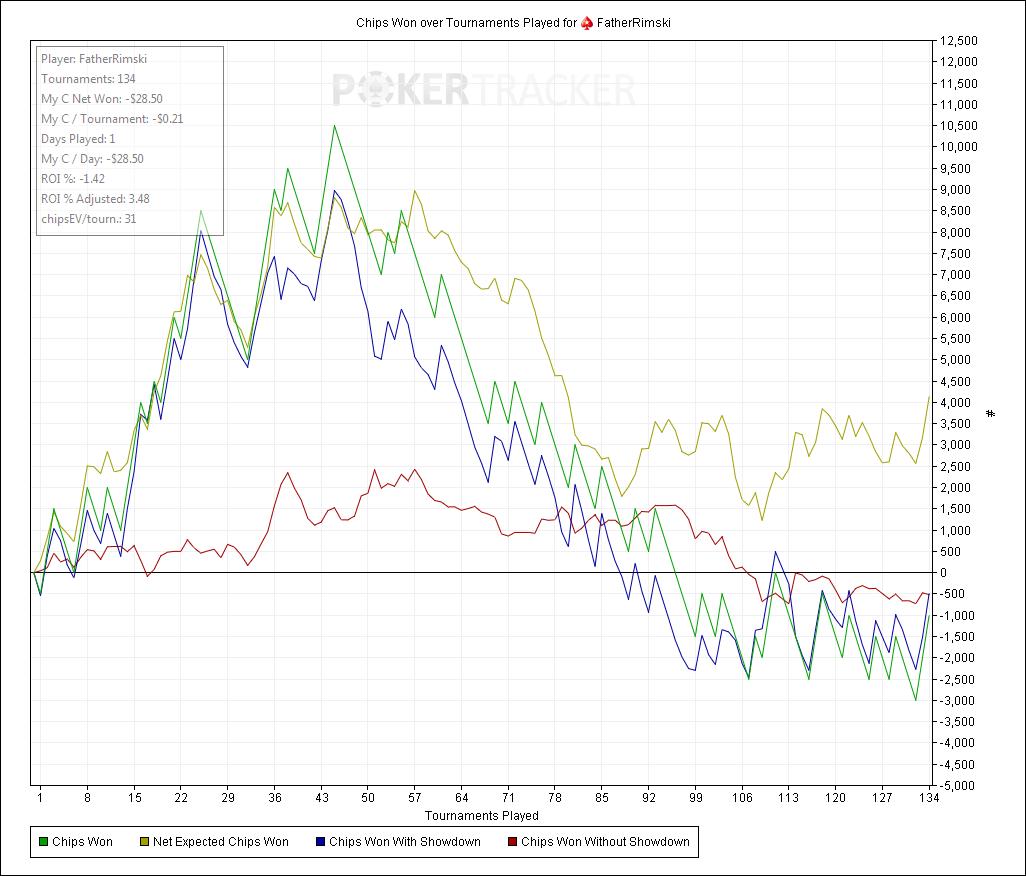 Как видно, миллиона нет, зато скоро будет дергающийся глаз ) Нереальный недобор по множителям, одни Х2. Чипс ев очень маленький, учитывая идиотов, которые пушат эни ту. На досуге пытался посчитать, сколько нужно иметь чипс ев, чтобы играть в ноль, получились такие подсчеты : комиссия на спинах составляет на 5-ках - 35 чипс ев, на 15-ках - 25 чипс ев, т.е. это и есть игра в ноль на этих лимитах. Я просто тупо разделил отношение комиссии к байину, и потом проделал тоже самое в фишках. Может и неправильно, но вроде противоречия не вижу ))