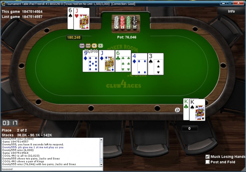 ($105.50, 2 players)Hero bets $106, scaramanga20 goes all-in $169.95, Hero calls $63.95