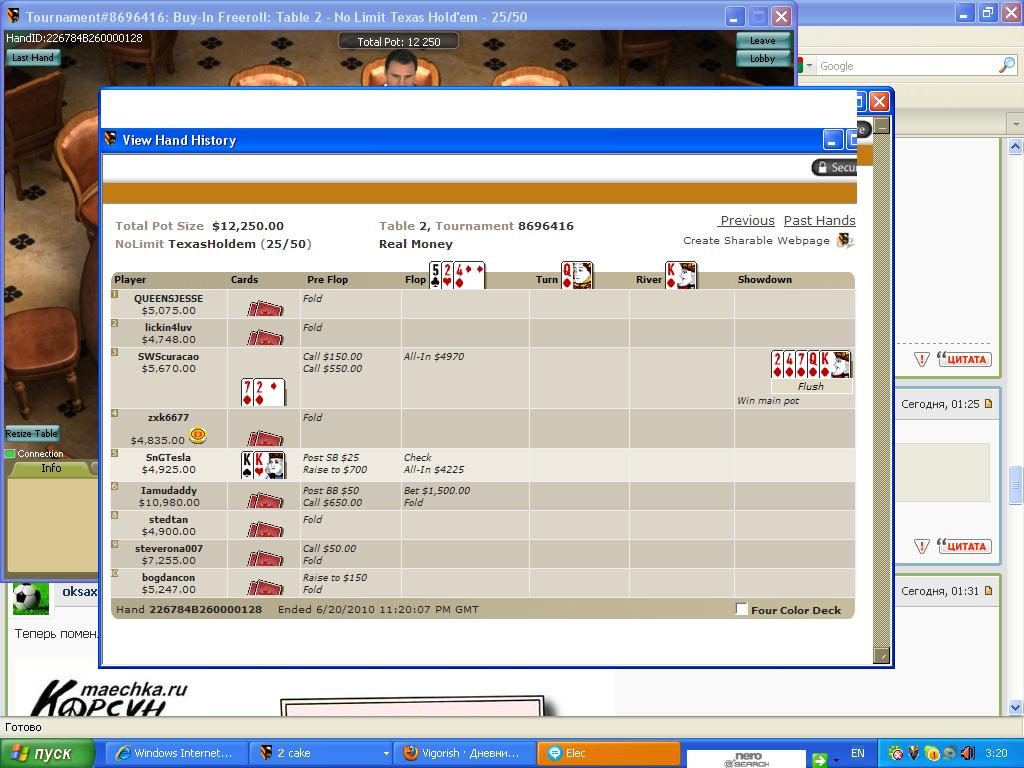 leninbaiker, так что? Ты переходишь на ФТП?leninbaiker:Играю на PS без перерыва на протяжении 3 месяцов и после разок игранул на фултиле---нет эмоциям предела: на PS стрит доезжает чаще, чем флешь, вроде всё как надо, да вот только какой стрит, именно чудесайный, а на FTP флеш доезжает в 70 % случаев, если не чаще. вот и думай , где играть, да ещё и с такими заманчивыми структурами турнира)