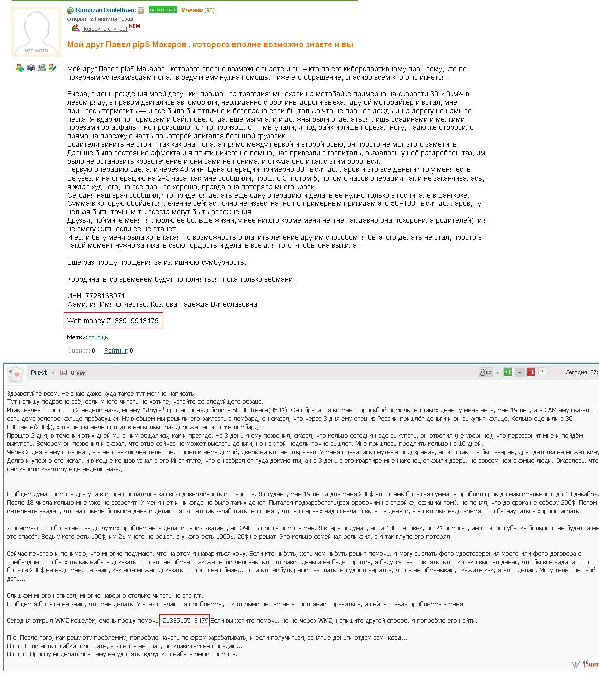Тут напишу подробно всё, если много читать не хотите, чатайте со следуйщего обзаца. Итак, начну с того, что 2 недели назад моему *Друга* срочно понадобились 50 000тенге(350$). Он обратился ко мне с просьбой помочь, но таких денег у меня нету, мне 19 лет, и я САМ ему сказал, что есть дома золотое кольцо прабабушки. Ну в общем мы решили его закласть в ломбард, он сказал, что через 3 дня ему отец из России пришлёт деньги и он выкупит кольцо. Кольцо оценили в 30 000тенге(200$), хотя оно конечно стоит в несколько раз дороже, но это же ломбард... Прошло 2 дня, в течении этих дней мы с ним общались, как и прежде. На 3 день я ему позвонил, сказал, что кольцо сегодня надо выкупать, он ответил (не увернно), что перезвонит мне и пойдём выкупать. Вечером он позвонил и сказал, что отце сейчас не может выслать деньги, но на этой недели точно вышлет. Мне пришлось продлить кольцо на 10 дней. Через 2 дня я ему позвонил, а у него выключен телефон. Пошёл к нему домой, дверь ни кто не открывал. У меня появились смутные подозрения, но это так... я был уверен, друг детства не может кинуть. Долго и упорно его искал, и в коцне концов узнал в его Институте, что он забрал от туда документы, а на 3 день в его квартире мне наконец открыли дверь, но совсем незнакомые люди. Оказалось, что они купили квартиру еще неделю назад. В общем думал помочь другу, а в итоге поплатился за свою доверчивость и глупость. Я студент, мне 19 лет и для меня 200$ это очень большая сумма, я проблил срок до максимального, до 18 декабря. После 18 числа кольцо мне уже не возротят. У меня нет и никогда не было таких денег. Пытался подзаработать(разноробочим на стройке, официантом), но понял, что до срока не соберу 200$. Потом в интернете увидел, что на покере большие деньги делаются, хотел так заработать, но понял, что во первых надо сначало вкласть деньги, а во вторых надо время, что бы научиться хорошо играть. Я понимаю, что большенству до чужих проблем нету дела, и своих хватает, но ОЧЕНЬ прошу помочь мне. Я вчера подумал, если 100 человек, по 2$ помогут, им от этого убытка большого не будет, а меня это спасёт. Ведь у кого есть 100$, им 2$ много не решат, а у кого есть 1000$, 20$ не решат. Это кольцо семейная реликвия, а я так глупо его потерял... Сейчас печатаю и понимаю, что многие подумают, что на этом я навариться хочу. Если кто нибуть, хоть чем нибуть решит помочь, я могу выслать фото удостоверения моего или фото договора с ломбардом, что бы хоть как нибуть доказать, что это не обман. Так же, если человек, кто отправит деньги не будет против, я буду тут выстовлять, кто сколько выслал денег, что бы все видили, что больше 200$ не надо мне. Не знаю, как еще можно доказать, что это не обман... Если кто нибуть решит выслать, но удостоверится, что я не обманываю, скажите как, я это сделаю. Могу телефон свой дать... Слишком много написал, многие наверно столько читать не станут. В общем я больше не знаю, что мне делать. У всех случаются проблеммы, с которыми он сам не в состоянии справиться, и сейчас такая проблемма у меня... Сегодня открыл WMZ кошелёк, очень прошу помочь. Z133515543479 Если вы хотите помочь, но не через WMZ, напишите другой способ, я попробую его найти. П.с. После того, как решу эту проблемму, попробую начать покером зарабатывать, и если получиться, занятые деньги отдам вам назад... П.с.с. Если есть ошибки, простите, всю ночь не спал, по клавишам не попадаю... П.с.с.с. Просшу модераторов те