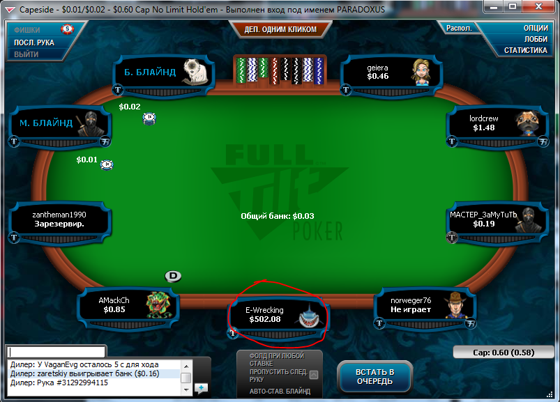 -ом, который хз чё делает с 500$ на 0,01/0,02 кеп столе