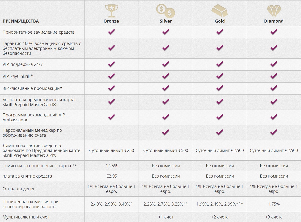 Для игроков в покер она в первую очередь полезна тем, что позволяет быстро и анонимно выводить средства из покер-рума. Все покер-румы работают со Skrill. В большинстве из них это и самый быстрый способ, иногда моментальный (например, PokerStars). Из Skrill деньги можно отправить на банковскую карту или банковский счет. Второй вариант лучше подойдёт для сумм от 2000$, зачисление происходит в течение трех рабочих дней, чаще быстрее. На привязанную банковскую карту установлены лимиты до 500-700$ за транзакцию. Skrill также удобен для депозитов или внутренних переводов. В системе есть несколько видов аккаунтов, каждый со своими возможностями. Наша поддержка в моём лице, а также в лице модератора Ingvar поможет вам во всем этом разобраться и получить дополнительные преимущества после регистрации от Vigorish. Преимущества регистрации от Vigorish: • Информационная поддержка: мы постоянно на связи с менеджерами Skrill и накопили полезный опыт, которым готовы поделиться. • Упрощенная процедура получения безлимитного счета: Skrill устанавливает лимиты на исходящие транзакции, которые для начинающих игроков вполне достаточные, но профессионалы не раз сталкивались с необходимостью их снять. • В ближайшем будущем упрощенная процедура получения VIP статуса: VIP-аккаунты предоставляют чрезвычайно полезные преимущества, такие как: гарантия 100% возмещения средств с бесплатным электронным ключом безопасности, отсутствие комиссии за переводы, участие в VIP-клубе, VIP-поддержка, многочисленные акции и т.д. • Возможность открыть второй счет в другой валюте: без специальных договоренностей Skrill не разрешает открывать второй счет на свои же данные, но иногда полезно иметь счет как в долларах, так и в евро. Кроме этих, могут возникнуть и любые другие вопросы, в которых будет легче разобраться с нашей помощью. Если у вас еще нет аккаунта в Skrill, вы можете зарегистрировать его прямо сейчас. Перед регистрацией и переходом по ссылке не забудьте очистить кэш браузера и куки. Как получить VIP-аккаунт: Стандартные условия: ЧЗВ: Вопрос. Если я выведу из рума на букерсы какую-либо сумму, а потом депну ее в этот же рум и так несколько раз, пока не набью 6к евро, то такие депозиты засчитают для випа? Ответ. Могут не засчитать, но обычно засчитывают. Лучше вывести из рума, например, на карту, и депнуть назад в рум уже через Скрилл. Делать кешаут желательно уже после получения ВИП-статуса. Также можно депозитить в букмекерские конторы, казино и т.п. Преимущества VIP: На наш взгляд два главных преимущества VIP-статуса: 1. Возможность иметь счета в нескольких валютах. 2. Главное преимущество: Бесплатная предоплаченная карта Skrill Prepaid MasterCard После вывода средств из покеррума в Skrill можно пойти и сразу снять средства в одном из ~2 миллионов банкоматов мира. Так например, у меня статус VIP Silver и я просто снимаю в абсолютно любом банкомате без комиссии. Очень удобно, рекомендую. Внимание: Переход по ссылке не обеспечивает моментальную привязку к аффилиейту Vigorish. Привязка возможна только в том случае, если, перейдя по данной ссылке, вы получили VIP-статус и не были до этого привязаны к другому аффилиейту. Моментально привязать счет можно только при регистрации нового аккаунта по любой из наших ссылок. Также вы можете задавать любые вопросы в этой теме, или получить оперативную поддержку в Skype: Игорь, логин: raving_ingvar Александр, логин: san