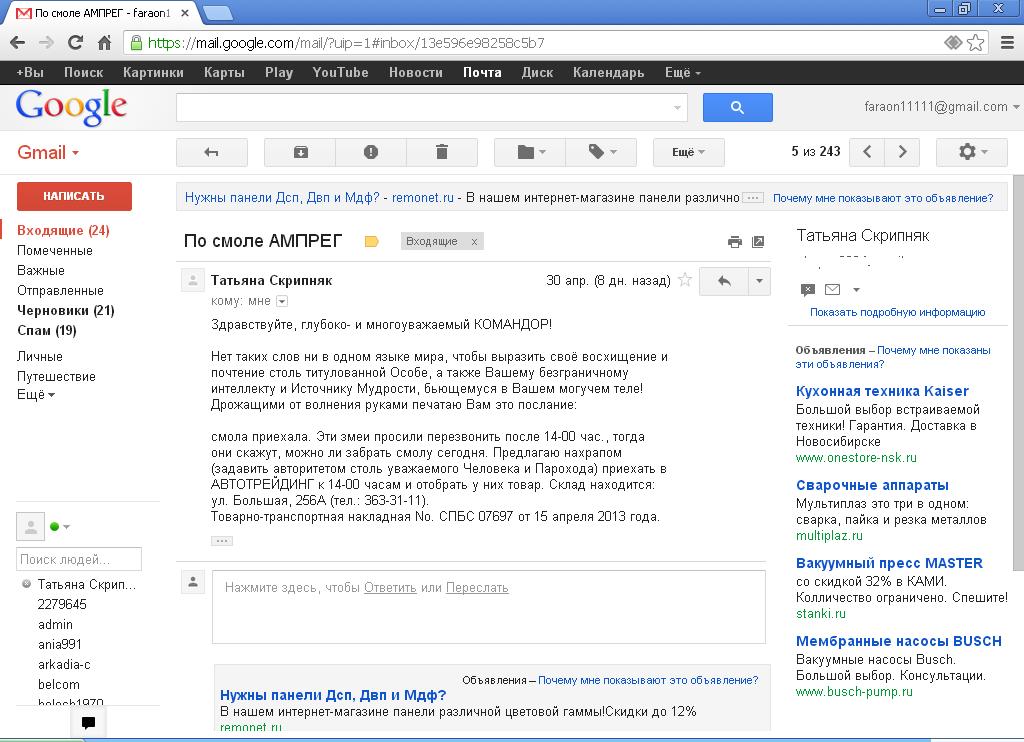 Из моей деловой переписки. Поехал получать смолу эпоксидную, из Питера для меня пришла. Как раз перед праздником дело было, суета.. В этом послании важен был номер накладной. Я листок сложил так, чтобы только номер виден. Сунул под нос диспетчеру, та завопила - сказано же было сперва позвонить! Потом, машинально, развернула текст. Посмотрела на меня. Смылась. Пришли втроем, одна, видать начальница. Тоже давай меня рассматривать. Оглянулся, за спиной охранник набычился. Вспомнил, как год назад меня , "мудрого и могучего, человека - парохода" в ментовку волокли из магазина детских игрушек, где я права качал за самокат для пацаненка.