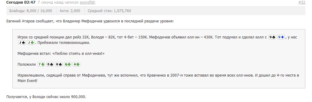 Создаю колодец, где постараюсь отвечать на любые вопросы. UPD. Прошел почти год с момента создания дневника. Думаю, что как игрок серьезно вырос. Правда, и оппоненты тоже не стояли на месте, покер стремительно развивается. Кеш игры становятся очень жесткими, агрессивными. Выигрывать все труднее и труднее. С турнирами сейчас все обстоит не так плохо, там все еще хватает слабых игроков. Мои основные успехи связаны именно с МТТ, в кеше не могу похвастаться стабильными выигрышами. Отчасти поэтому решил сместить акцент на турнирную игру, кеш играю существенно меньше сейчас. Не могу забросить, т.к. все-таки игра на деньги хедзап остается моим любимым видом игры. UPD2. К сожалению, в связи с черной полосой, в которой я проиграл приличную часть банкролла, играя кеш 6макс омаху, получается, что за год я не поднялся по лимитам, а даже слегка спустился. Сейчас играю нл200-600 холдем, пло200 и любые мтт. По банкроллу могу играть игры дороже, но сейчас стал намного более консервативен в этом плане и не поднимусь выше, пока не появится уверенность, что бью текущие игры. UPD (05.2011). Практически полностью переключился на мтт. Хочется быть уверенным в своей компетентности и в кеше, но скоро предстоит поездка на всоп. Поэтому решил сосредоточиться на турнирах. UPD (07.2012). Решил изменить курс дневника на туристические дела вне покерного стола. Буду отписываться о дальнейших путешествиях. Пишите, задавайте свои вопросы ![]() Последний раз редактировалось useint 30 июл 2012, 22:32, всего редактировалось 21 раз(а).