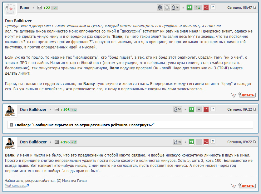 Модераторы не всегда успеют отреагировать. Вот, Априсобаль, к примеру, несколько дней здесь не появляется. Представьте, что развернётся какая-то жаркая полемика и одна группа будет минусовать другую. Тогда, выбрав момент, и поставив одновременно 5 минусов, можно просто стирать сообщения оппонентов. А потом читаешь тему и как будто разговор по телефону с одной стороны слушаешь. Я против удалений. Лучше делать так, что посты набравшие 5 минусов, будут учитываться в профиле пользователя. И вообще, чтобы в профиле были ссылки на самый плюсовый, самый минусовый и, самое интересное, на самый противоречивый пост каждого пользователя. Пользователям, у которых набирается слишком много минусовых постов, а плюсовых мало, надо просто автоматически временно блокировать возможность писать на форуме, а посты не тереть, если они явно правил не нарушают. Тогда прежде чем в дискуссию с таким человеком вступать, каждый может посмотреть его профиль и выяснить, а стоит ли. Найди цель, ресурсы найдутся. (C) Махатма Ганди