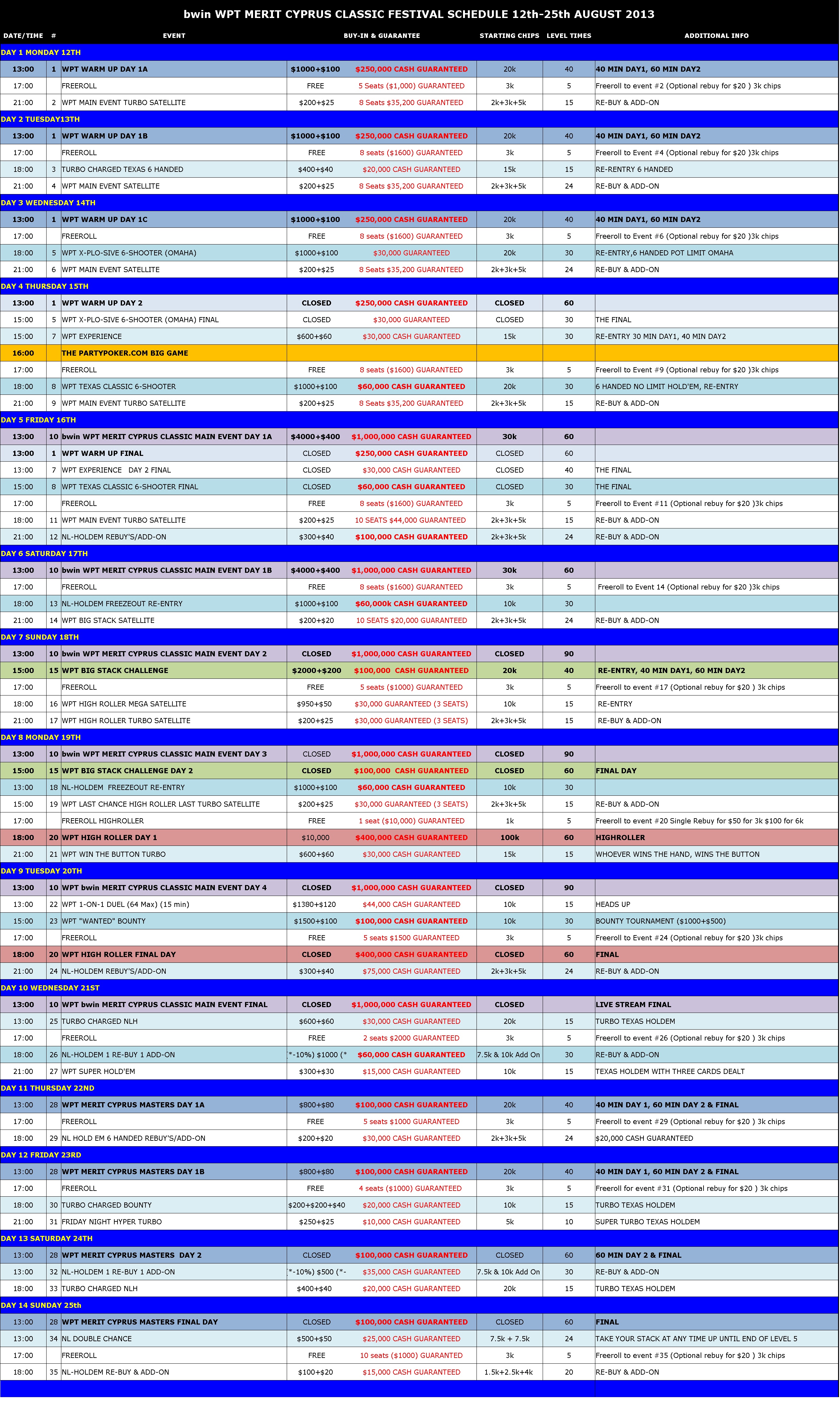 Турнир пройдет на Северном Кипре с 12 по 25 августа 2013г. в шикарном отеле Merit Crystal Cove & Casino***** Гарантия на всю серию $ 3.000.000! В главном турнире с бай-ином $4.400 гарантированный призовой фонд составляет $1.000.000, а финальный стол будет транслироваться онлайн в прямом эфире. Структура WPT : стандартная для WPT Main Event — два стартовых дня, с возможностью повторного входа в день 1B. Турнирным директором будет самый популярный турнирный директор в мире - Мэтт Саваж (Matt Savage). Мэтт Саваж считается живой легендой покера. Он участвовал в 300 телевизионных шоу практически на всех телеканалах (среди них Fox Sports Net, Travel Channel, GSN и ESPN). Имел опыт руководства иностранными турнирами (Asian Poker Tour Macau). Однажды исполнял роль директора на WSOP, засветился на голубом экране в качестве актера в фильме «Lucky You». Будучи основателем Ассоциации директоров покерных турниров, получил награду за выдающиеся услуги в покер индустрии. Специально приглашенные звезды мирового покера: Рой Винстон (Roy Winston) - победитель WPT Borgata (2008г.) Майкл Мизрахи (Michael Mizrahi) - обладатель 3 браслетов WSOP и победитель двух серий WPT. Келли Ким (Kelly Kim) - 8 место WSOP (2008г.) Антонио Эсфандиари (Antonio Esfandiari) - обладатель 3 браслетов WSOP, победитель турнира WPT. Турнирным игрокам предлагаем спецпакеты! 1) Полный пакет WPT MERIT CLASSIC 11- 25 августа ,2013 15 дней и ночей в отеле Merit Crystal Cove Hotel and Casino, питание и напитки «все включено». ($3000 Single - $3900 Double) Трансфер (Larnaca или Ercan Airport ) ($150) 12.08. - (13:00) Event #1 $1,100 WPT WARM UP NL Hold’em (DAY1A) $250K Guaranteed ($1,100) 14.08. - (21:00) Event #6 $225 SATELLITE TO WPT MAIN EVENT WITH REBUY $35,200 Guaranteed 8SEATS ($425) 15.08. - (15:00) Event 7 $660 NL Hold’em WPT Experience Event $30K Guaranteed ($660) 16.08. - (13:00) Event #10 WPT CYPRUS MAIN EVENT $4,400 NL HOLDEM DAY1A ($4,400) $1,000,000 Guaranteed Cash 18.08. - (21:00) Event #17 $225 SATELLITE TO HIGH ROLLER EVENT WITH REBUY $30,000 Guaranteed 3 SEATS ($425) 19.08. - (21:00) Event #21 ($660) NL HOLDEM WIN THE BUTTON 30K CASH GUARANTEED ($660) 20.08. -(21:00) Event #24 ($340) WITH REBUY GUARANTEED CASH ($640) $75,000 Guaranteed Cash. 21.08. - (21:00) Event #27 NL Super Holdem ($330 ) $15,000 Guaranteed Cash($330) 22.08. - (13:00) Event # 28 $880 NL Hold’em ($880) Day1A $100,000 Guaranteed Cash($880) 24.08. - (18:00) Event #33 $440 Turbo Charged 20K CASH GUARANTEED ($440) 25.08. - (13:00) Event #34 $550 DOUBLE CHANCE 25K CASH GUARANTEED ($550) Себестоимость пакета: $13,660 (Single) $14,560 (Double) Стоимость пакета со скидкой: Single $11,700 DOUBLE $12,500 Cумма buy-in в пакете: $10,510 2) Сателлит пакет WPT MERIT CLASSIC 11-25 августа,2013 15 дней и ночей в отеле Merit Crystal Cove Hotel and Casino, питание и напитки «все включено» ($3000 Single - $3900 Double) Трансфер в обе стороны (Larnaca или Ercan Airport ) ($150) 12.08. - (13:00) Event #1 $1,100 WPT WARM UP NL Hold’em (DAY1A) $250K Guarnteed ($1,100) 13.08. - (21:00) Event #4 $225 SATELLITE TO WPT MAIN EVENT WITH REBUY $35,200 Guaranteed 8SEATS ($425) 14.08. - (21:00) Event #6 $225 SATELLITE TO WPT MAIN EVENT WITH REBUY $35,200 Guaranteed 8SEATS ($425) 15.08. - (21:00) Event #9 $22 5Turbo SATELLITE TO WPT MAIN EVENT WITH REBUY $35,200 Guaranteed 8SEATS ($425) 18.08.- (21:00) Event #17 $225 SATELLITE TO HIGH ROLLER EVENT WITH REBUY $30,000 Guaranteed 3 SEATS ($425) 19.08.- (21:00) Event #19 $225 SATELLITE TO HIGH ROLLER EVENT WITH REBUY $30,000 Guaranteed 3 SEATS ($425) 20.08. - (21:00) Event #24 ($340) WITH REBUY GUARANTEED CASH ($640) $75,000 Guaranteed Cash. 21.08. - (21:00) Event #27 NL Super Holdem ($330 ) $15,000 Guaranteed Cash($330) 22.08. - (13:00) Event # 28 $880 NL Hold’em Day1A $100,000 Guaranteed Cash($880) 24.08. - (18:00) Event #33 $440 Turbo Charged 20K CASH GUARANTEED ($440) 25.08. - (18:00) Event #35 ($120) NL Holdem with rebuy, Cash guaranteed $15,000 ($220) Себестоимость пакета: $8,885 (Single) $9,785 (Double) Стоимость пакета со скидкой: Single $6,500 Double $7,000 Сумма buy-in в пакете $5,735 Те, кто уже бывал на турнирах знают, что казино и покер рум находятся непосредственно в гостинице Merit Crystal Cove. В покер руме круглосуточно (бесплатно) : алкоголь, прохладительные напитки, еда и закуски, чай, кофе, сигареты. WPT Merit Cyprus Classic даёт игрокам возможность побороться за огромные деньги в райском уголке земного шара. Лето на Кипре проходит под знаком солнца, моря и активного отдыха - водных лыж, гольф
