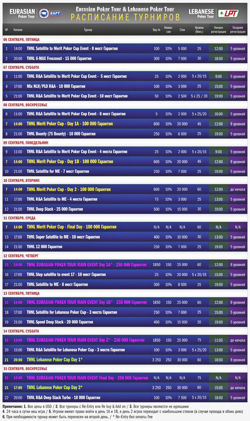 06 -15 Сентября 2013, Киев (ПК Крещатик) Уважаемые друзья! Как всем уже известно, компания Poker Club Management занимается организацией и проведением турниров по покеру уже более 10 лет. Мы делаем разные турниры в различных странах (Кипр, Украина, Египет, Болгария, Мальта и т.д). EUARASIAN POKER TOUR За время нашей многолетней работы мы организовали множество турниров (Red Sea Poker Cup, Mediterranean Poker Cup,и т.д.), а также наладили сотрудничество с партнерами из многих стран, таких, как: Кипр, Турция, Италия, Ливан, Египет, Черногория, Украина, Болгария, Румыния и другие. Все это привело к созданию единой серии по покеру: EurAsian Poker Tour (EAPT), которая будет промоутироваться всеми нашими партнерами, где каждый из них является со-организатором данного тура и будет объединять всех игроков из многих стран. ПАРТНЕРЫ Основными партнерами и со-организаторами серии являются: Merit Poker (игроки из Турции), Lebanese Poker Tour (игроки из Ливана) и Poker Club Management (СНГ). Также в число партнеров входят единственный легальный покерный клуб Казахстана “Cash Villi Poker Club” (Астана) и болгарский покерный клуб “Finix”. Первым этапом станет турнирная серия в Киеве с 06 по 15 сентября. Место проведения - лучший покерный клуб Киева “Крещатик”. Гарантия на всю серию более 500 000 $! Следующими этапами будут Казахстан, Болгария и Кипр. MERIT POKER CUP Серия в Киеве будет проведена при поддержке всех наших партнеров, и особенно при тесном сотрудничестве с отелем «Merit Crystal Cove» на Кипре и управляющим покерного клуба отеля Майклом Пелтекки. Один из основных турниров так и будет называться Merit Poker Cup. Он будет с достаточно недорогим бай ином (600$) двумя входными днями, плавной структурой и гарантией 100 000$! Все турниры на Кипре собирают большое количество участников из Турции, Ливана, России, Украины, Румынии, Италии, Израиля, Кипра. Благодаря рекламе на предстоящих сериях в июле и августе, и налаженному сотрудничеству, большинство иностранных игроков из вышеприведенных стран будут приглашены в Киев. Сентябрь - комфортное время в Киеве и многие участники серий на Кипре с удовольствием приедут на первый этап. LEBANESE POKER CUP В серии представлены турниры с различными бай инами, и множеством сателлитов на Мейн,и на более дорогой турнир, который называется Lebanese Poker Сup. Данный турнир сделан с более дорогой входной платой и будет интересен, не только местным участникам, но и ливанцам, туркам и другим бизнесменам из различных стран, которые любят приезжать играть в покер именно на выходные. MAIN EVENT (Главное событие) Входная плата на главное событие (Main Event) составит 2 000 $, начальный стек 25 000 фишек. Гарантия 250 000 $, два входных дня, уровни по 60 - 75 минут. Профессионализм команды компании Poker Club Management, сотрудников клуба Крещатик, достопримечательности Киева и удачное время проведения, сделают данный этап серии привлекательным для всех наших иностранных партнеров. Многие из них (особенно игроки из Ливана) уже давно спрашивали нас о проведении серии именно в Киеве. Одним из инструментов привлечения иностранных участников, помимо рекламы, станет налаженная джанкет программа для наших партнеров. ПОКЕРНЫЙ КЛУБ «КРЕЩАТИК» Местом проведения первого этапа серии является покерный клуб Крещатик – лучший клуб Восточной Европы, соответствующий всем международным стандартам для проведения такого рода турниров. РАСПИСАНИЕ Турнирный директор серии: Артур Восканян WPT и EAPT Всемирно 
