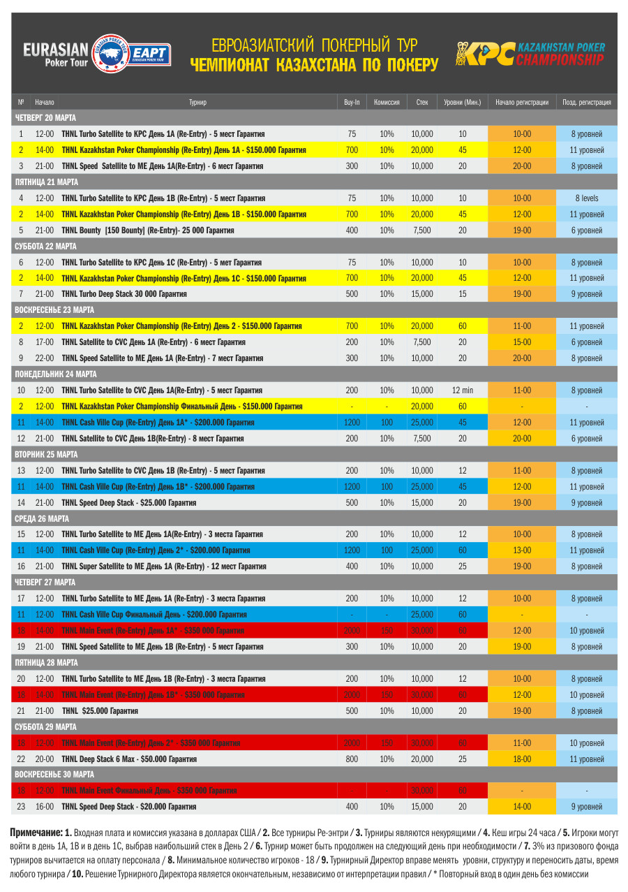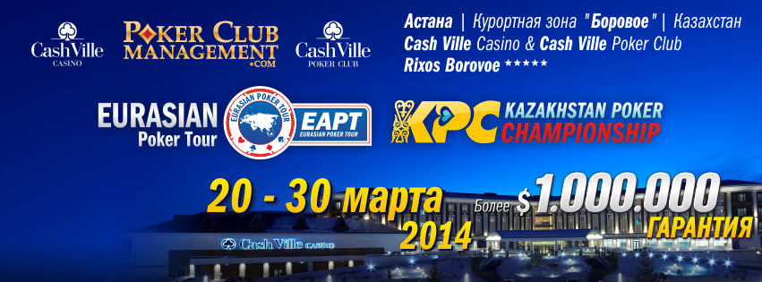 Eurasian Poker Tour Гарантия более $ 1 000 000 Астана, Курортная зона Боровое, Rixos Borovoe, Cash Ville Casino & Poker Club 20-30 марта, 2014. EAPT - серия, которую ждали. Дорогие друзья! Мы возвращаемся в Казахстан с третьей остановкой покерного тура Eurasian Poker Tour! 20 марта Евроазиатский Покерный Тур – Eurasian Poker Tour (EAPT) возвращается в Казахстан, в удивительную первозданную курортную зону Боровое! Серию примет единственный легальный покерный клуб страны Cash Ville Poker Club, расположенный в роскошном пятизвёздочном комплексе Rixos Borovoe, наряду с крупнейшим казино Центральной Азии Cash Ville Casino. 11-дневный фестиваль покера готовит для своих гостей более миллиона долларов призовых, интересные турниры, развлекательные программы и круглосуточные кеш-игры. История EAPT: Eurasian Poker Tour – уникальная серия компании Poker Club Management. Основанный в 2013 году, Евроазиатский Покерный Тур громко заявил о себе ещё на дебютной остановке в Киеве, когда впервые на русскоязычную покерную серию прибыли звёзды мировой величины. Победу в Главном турнире одержал профессионал из Германии Марвин Реттенмейер, Игрок года European Poker Awards-2012, лидер рейтинга Global Poker Index, обладатель золота EPT, WPT. За титул EAPT сразились Александр Кравченко, Келли Ким, Андрей Патейчук, Дэвид Чино Рим, Владимир Трояновский, Алексей Ковальчук и многие другие известные на весь мир профессионалы. Призовой фонд серии превысил $ 700 000. После громкого успеха в Киеве, со второй остановкой серия EAPT прибыла в Казахстан, в покерный клуб Cash Ville Poker Club. Ряды русскоязычного покерного сообщества пополнили молодые и талантливые игроки из Казахстана. Чемпионом Главного события стал россиянин Александр Дубровский. Финальный стол транслировался в прямом эфире, в пиковый момент число зрителей превысило 3000 человек. Первые места сайд-ивентов заняли представители Казахстана, Украины и Турции. Один из турниров – Kazakhstan Poker Championship - собрал за столами рекордное для серии EAPT и всего Казахстана число игроков в одном отдельном турнире - 559. Общий призовой фонд серии побил киевскую планку и превысил $ 800 000. В марте 2014 года Eurasian Poker Tour возвращается в гостеприимный Казахстан, в роскошный отель Rixos, в крупнейшее казино центральной Азии Cash Ville Casino и, наконец, в покерный клуб Cash Ville Poker Club! И на этот раз гарантия на серию составляет более миллиона долларов! ОРГАНИЗАТОРЫ Организаторами Eurasian Poker Tour & Kazakhstan Poker Championship являются компании Poker Club Management (PCM), Cash Ville Casino и Cash Ville Poker Club. Во главе компаний стоят профессионалы, стремящиеся вывести покер в странах СНГ на качественно новый уровень. Poker Club Management – единственная в Восточной Европе покерная компания, существующая на рынке более 10 лет, на счету которой проведение одних из крупнейших международных покерных серий, в том числе WPT и RPS. Cash Ville Casino и Cash Ville Poker Club – флагманы легального игорного и покерного дела в Казахстане. Профессиональный союз Poker Club Management (PCM), Cash Ville Casino и Cash Ville Poker Club уже прошел проверку на прочность во время первого казахстанского этапа EAPT. Грядущая серия готовит для участников соревнований новые решения и смелые проекты, которые станут результатом совместного труда PCM, Cash Ville Casino и Cash Ville Poker Club. Турнирный директор серии – Артур Восканян, глава Poker Club Management, турнирный директор PokerStars Russian Poker Series (RPS), World Poker Tour (WPT). РАСПИСАНИЕ СЕРИИ 11-дневный фестиваль включает в себя 23 события! 20 марта стартует Чемпионат Казахстана по Покеру – Kazakhstan Poker Championship (KPC) 