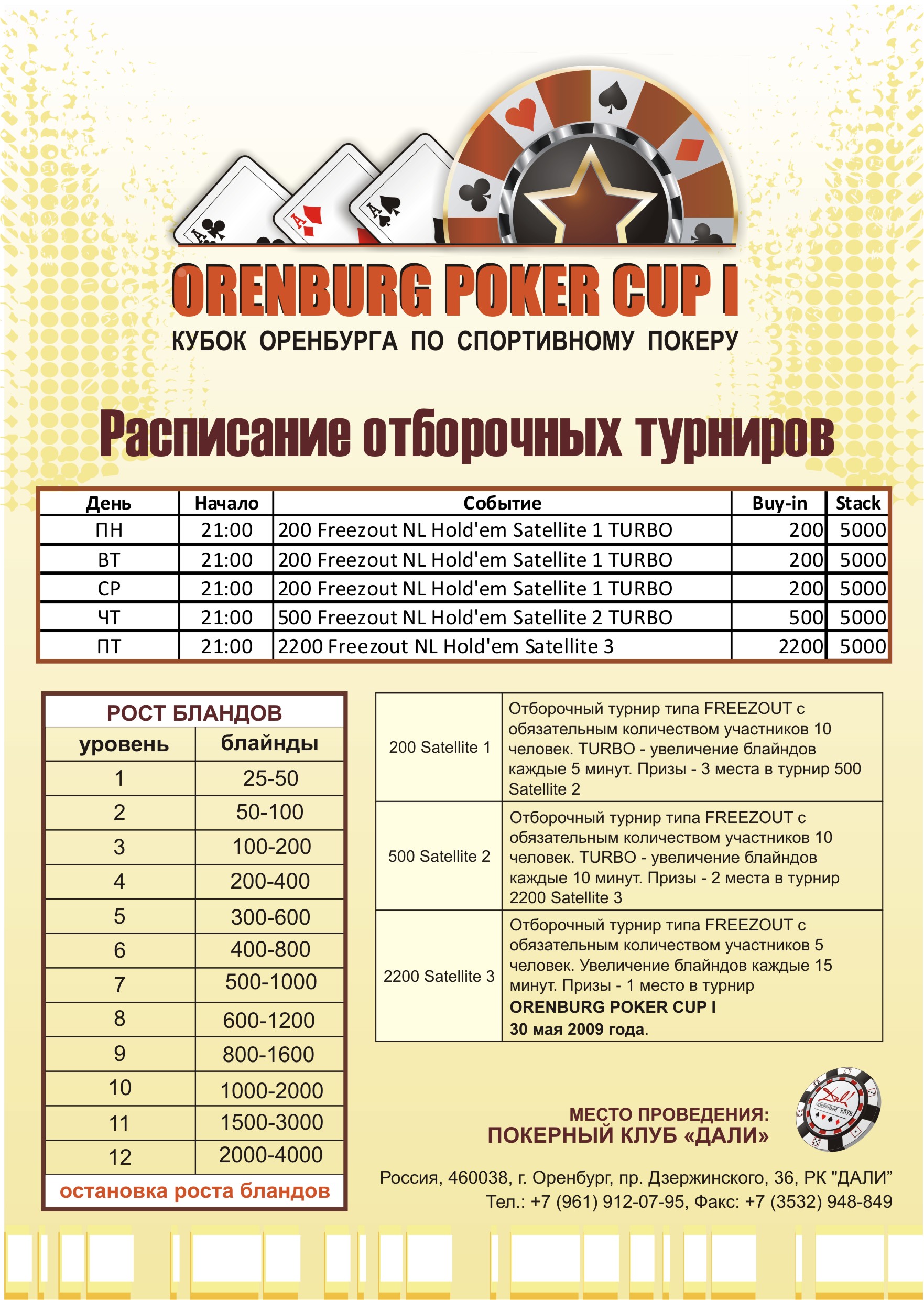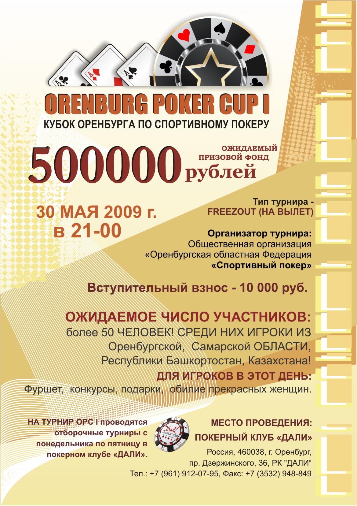 Всем доброго дня! Приглашаем всех принять участие в ORENBURG POKER CUP I. Заявки принимаются по тел. (3532) 26-41-36, dalipokerclub@yandex.ru