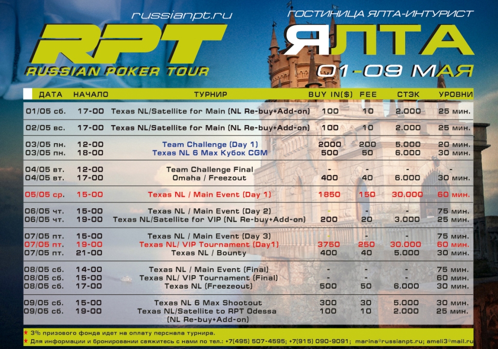 объявляют о проведении очередного этапа Russian Poker Tour Poker Style Group в партнерстве с Poker Club Management объявляют о проведении очередного этапа Russian Poker Tour в Ялте. Турнир пройдет во время майских праздников с 1 по 9 мая в Ялте. После хорошо подготовленного и успешно проведенного киевского этапа организаторы ожидают увидеть в Ялте все покерное сообщество России, Украины и других стран СНГ, а также игроков из Восточной Европы и Турции. Легендарный курорт Ялта, на который с советских времен съезжаются туристы со всего СНГ, на этот раз будет принимать один из крупнейших этапов RPT. В Ялте организаторы турнира ожидают более 200 участников. По словам основателя Russian Poker Tour Эрика Шахбазяна это связано не только с удачными датами, совпавшими с майскими праздниками, но и с неугасающим интересом к покеру в странах СНГ. «В марте 2010 года в столице Украины прошел крупнейший этап RPT /section57/topic5427.html , который стал самым массовым и крупным покерным событием в Украине, после ЕПТ. На главном событии RPT Kiev приняло участие более 230 игроков, призовой фонд основного события составил $427 350, главный приз турнира составил рекордные $122 000 для бай-ина в $2000 и забрал его московский игрок-любитель Сергей Шаронов, мы уверены, что в солнечной Ялте, на майских праздниках турнир станет не менее массовым». В Ялте на этапе RPT будут введены много новшеств. Так, впервые пройдет турнир по Омахе, турнир «Шутаут» и турнир по покерному многоборью, где участники будут соревноваться не только в покере, но также в шахматах и пляжному волейболу, что еще раз подчеркнет спортивную составляющую покера. Все турниры будут иметь привычную и так полюбившую игрокам глубокую сетку с уровнями от 25 минут. На Главном событии игроки получат стэк 30 000 фишек и уровни турнира будут по 60 минут в первый день и по 75 минут со второго дня. Артур Восканян, генеральный директор Poker Club Management: «Объединив усилия двух мощных компаний мы создаем продукт, которому нет равных в СНГ. Доказательство тому настоящий успех киевского этапа RPT который мы провели в марте 2010 года. Настоящее покерное событие со всеми лучшими его чертами: количество игроков, призовой фонд, профессиональная работа, дружественная атмосфера, отдых и качественная игра. Мы доказали всем, что даже с запретом покера в России он не теряет популярность и интерес в нашей стране. И значит мы не останавливаемся и движемся дальше! Мы снова ждем всех своих друзей на черноморском побережье Украины, в одном из самых красивых городов Украины – Ялте». Этап RPT в Ялте пройдет в конференц-зале, на 16 этаже, крупнейшей гостиницы Черноморского побережья «Ялта - Интурист» по адресу: ул. Дражинского 50. В большом зале будут расположены 29 игровых столов на 4 больше чем в Киеве. За игрой, как всегда, будет следить лучший профессиональный состав дилеров и инспекторов компании Poker Club Management. Входной взнос на основное событие Ялтинского этапа составит $2000. Гости турнира смогут совместить игру в крупнейших турнирах и активный отдых. В рамках Russian Poker Tour Ялта, организаторы обещают устроить специальные турниры по футболу, пляжному волейболу, биллиарду и водному поло среди покерных игроков, также, так полюбившийся игрокам, RPT Party пройдет в лучшем ночном клубе Ялты. Участвуют игроки: России, Украины, Белоруссии, Греции, Казахстана, Турции, Армении и др. стран Страница турнира: http://www.russianpt.ru Организаторы т
