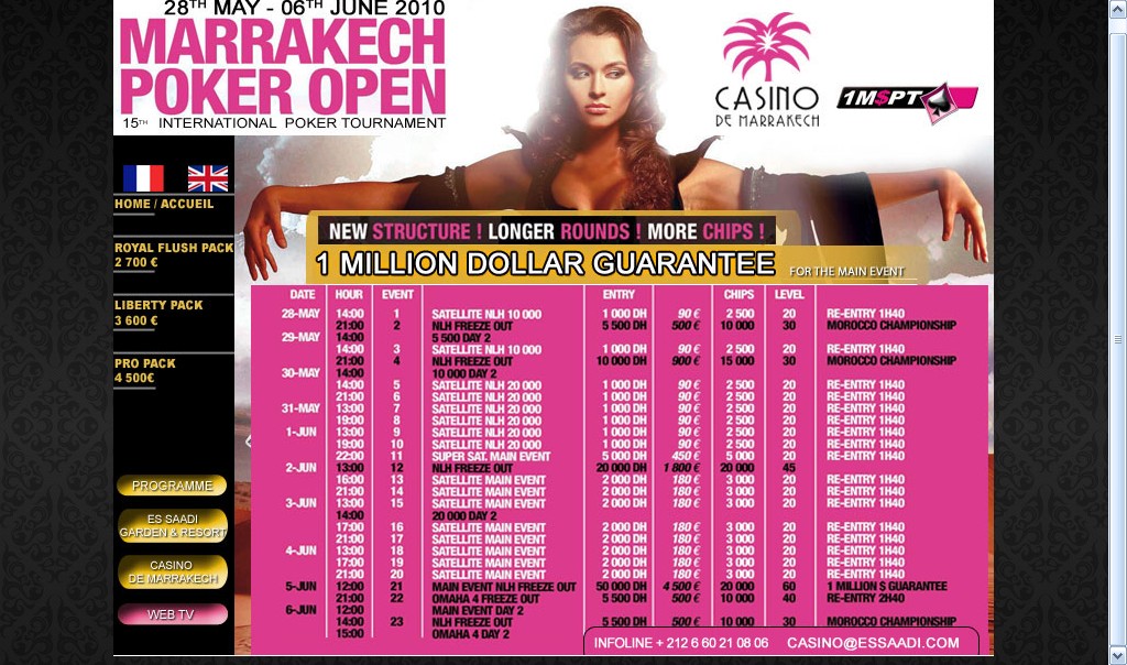 Еще один турнир в Марокко. http://www.poker-marrakech.com/index.htmlНапоминаю, что для граждан РФ, въезжающих на территорию Марокко, въезд безвизовый, достаточно предоставить заграничный паспорт и туристический ваучер. Русскоязычного персонала здесь больше чем в Танжере