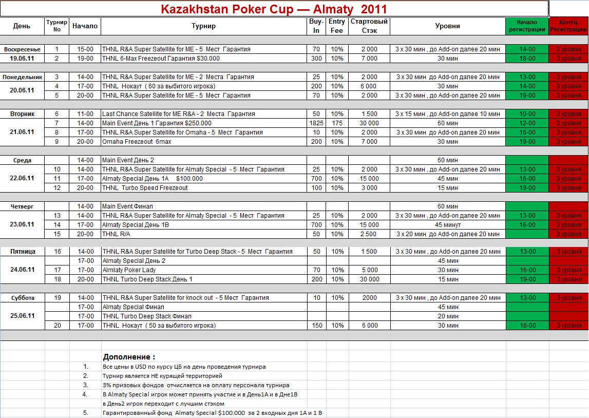 Дамы и господа, разрешите представить Вашему вниманию турнир, который пройдёт в Казахстане в городе Алматы. Покер в Казахстане молод, но развивается очень быстро, и уже не за горами первый международный турнир и первые международные успехи казахстанских игроков. Дамы и Господа, представляем Вашему вниманию: с 19 по 25 июня в конференц-зале гостиницы “Казахстан” во главе с Республиканской Федерацией Игроков и Любителей спортивного Покера Республики Казахстан, при поддержке Kazakhstan Poker Development и RMPC пройдёт первый международный турнир. Kazakhstan Poker Cup 3 турнира с Гарантированным призовым фондом. Main Event - $250.000, Almaty Special - $100.000, 6MAX Freezeout - $30.000 Почётный гость турнира - Вице президент Международной Федерации Покера Oliver Chubb (Оливер Чаб) Турнир организует и проводит команда опытных менеджеров Russian Masters Poker Cup во главе с Дмитрием Ганиным. Турнирный директор – Дмитрий Ганин. В послужном списке этой команды множество успешных турниров - RPT, RPS, RMPC. Каждый день будут проходить несколько турниров по спортивному покеру. Днём и вечером, Холдем и Омаха, с докупками и без, турниры по нокаут системе и турнир Big Stack Turbo, турнир для прекрасных дам, большое количество отборочных сателлитов и конечно 2 основных турнира серии- Main Event и Almaty Special c 2-мя днями входа. Каждый сможет найти себе состязание по вкусу. Для размещения участникам турнира предлагаются номера в гостинице Казахстан. Предусмотрены специальные цены и скидки. Ознакомиться с номерами можно на сайте гостиницы: http://www.kazakhstanhotel.kz По вопросам бронирования обращаться то телефонам: +77272590909, +7727 2919101 При бронировании обязательно указать, что бронь для игрока покерного турнира Kazakhstan Poker Cup. Отборочные турниры в ближайшее время начнутся в клубах спортивного покера: “ Казахстан “ - г. Алматы Казахстан тел. +7 (727) 291 91 60 “ МОСТ“ - г. Алматы Казахстан тел. +7 (702) 220 08 90 “ РИТЦ “ - г. Алматы Казахстан тел. +7 (701) 816 81 68 “Арт Рейз” - г. Астана Казахстан тел. +7 (701) 724 76 78 “Крещатик” - г. Киев Украина тел. +380 673 807 471 Вот расписание серии: (нажмите, чтобы увеличить) Ожидается большое количество не только местных игроков, но и игроков из других стран: • Из Киргизии, где покер также стремительно набирает обороты и как пример, недавний турнир Naurys Cup 2011, куда прибыло более 20 игроков из Киргизии и половину финального стола составили представители этой страны. • Из Украины – украинским покерным игрокам будет интересно попробовать свои силы на новом поле и получить новые эмоции от визита в новую страну. Ну а партнёр KPC - Клуб “Крещатик” и его глава Константин Резниченко в дополнительном представлении не нуждаются. • Из России - для большого количества игроков из России удобнее и дешевле приехать в Алматы, чем путешествовать в другие места Большого Покера, а отсутствие покера на Родине и возможность поиграть на новом поле послужит дополнительным стимулом для игроков из России. Посетить Казахстан Россиянам можно по внутреннему гражданскому паспорту, что также огромный плюс. • Китая - своей страстью к игре игроки из Поднебесной известны всему миру. Близость к Казахстану, запрет на покер в родных стенах (за исключением Макао), тесные торговые и туристические контакты этих 2-х стран, а также работа по продвижению турнира позволяют организаторам рассчитывать на весомый десант игроков из этой страны. Подробности Вы сможете узнать по телефонам: Алматы, те