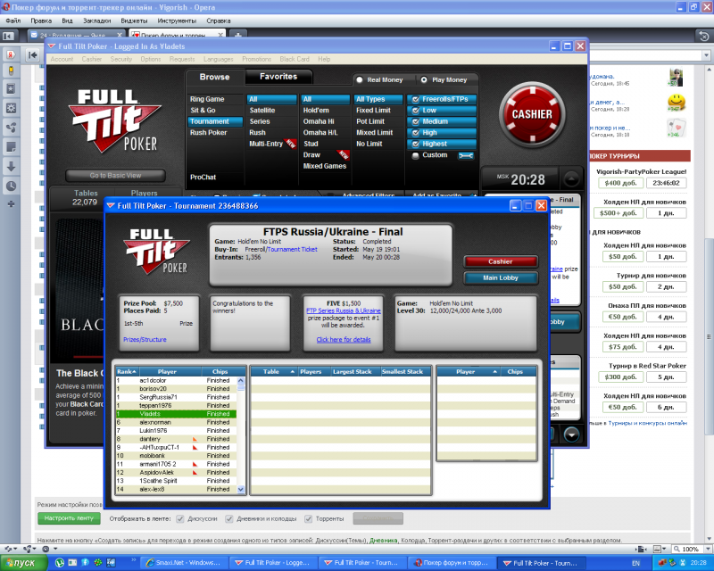 Full Tilt Poker совместно с Poker Club Management проводит серию“живых” турниров для игроков из России и Украины. Участвуйте в серии турниров Full Tilt Poker Series – Russia & Ukraine, сателлиты уже начались! Full Tilt Poker и Poker Club Management представляют серию “живых” турниров Full Tilt Poker Series – Russia & Ukraine. Все турниры Full Tilt Poker Series – Russia & Ukraine проводятся в Украине, г. Киев , гостиница «Русь». Серия проводится при поддержке Федерации Спортивного Покера Украины. Даты проведения «живых» турниров: Серия турниров №1: 24 – 31 июля Серия турниров №2: 18 – 25 сентября Серия турниров №3: GrandFinal: 18 – 27 ноября Чтобы попасть на турниры Full Tilt Poker Series – Russia & Ukraine и сразиться с сильнейшими игроками России и Украины, не надо ехать за тридевять земель и платить вступительный взнос - вы можете совершенно бесплатно пройти квалификацию. Каждую неделю участниками турниров Full Tilt Poker Series – Russia & Ukraine будут становиться пять счастливчиков, прошедшие БЕСПЛАТНЫЙ онлайн отбор. Победители онлайн-отборов в дополнение к местам в турнирах серии получат также эксклюзивные уроки от игроков российской команды FullTiltPro - обладателя 2-x браслетов WSOP Виталия Лункина и рекордсмена WSOP Николая Евдакова. Когда будут проходить бесплатные отборочные онлайн турниры? Стать участником Full Tilt Poker Series – Russia & Ukraine очень просто. Фрироллы проходят ЕЖЕДНЕВНО. · С 1 мая по 17 июля – пройдет отбор на Серию «живых» турниров №1, которая пройдет в июле. · С 18 июля по 11 сентября – на Серию турниров №2 в сентябре. · С 12 сентября по 10 ноября – на Серия турниров №3 /GrandFinal, который состоится в декабре. Структура БЕСПЛАТНЫХ отборочных онлайн фрироллов: Фрироллы 1-го раунда будут проходить трижды в день, в 14:00 MSK (06:00 ET), 17:00 MSK (09:00 ET) и 20:00 MSK(12:00 ET). Вход в турнир бесплатный. В каждом фриролле будет разыгрываться по 100 билетов на еженедельный фриролл финального раунда. Фрироллы финального раунда будут проводиться каждый четверг в 19:00 MSK(11:00 ET) начиная с 5 мая. В каждом из них будет разыгрываться 5 мест на Главное событие ближайшей «живой» серии турниров . Когда будут проходить онлайн-сателиты? - по воскресеньям в 18:00 MSK (10:00 ET), бай-ин $150 + $13, $24+$2 разыгрывается пять мест турнира в живую - по средам в 18:00 MSK (10:00 ET), бай-ин $150 + $13, $24+$2 разыгрывается три места участника турнира в живую Призовой пакет/ место участника турнира в живую является бай-ином на Главное Событие и составляет: На Серию турниров №1 и №2 - $1,500 ($1,375 + $125). На Серию турниров №3 / GrandFinal- $2,500 ($2,300 + $200). Сателлиты уже стартовали, см. http://www.fulltiltpoker.com/ru/full-ti ... to-qualify Подробности: http://pokerclubmanagement.com/ru/news/ ... ___ukraine |