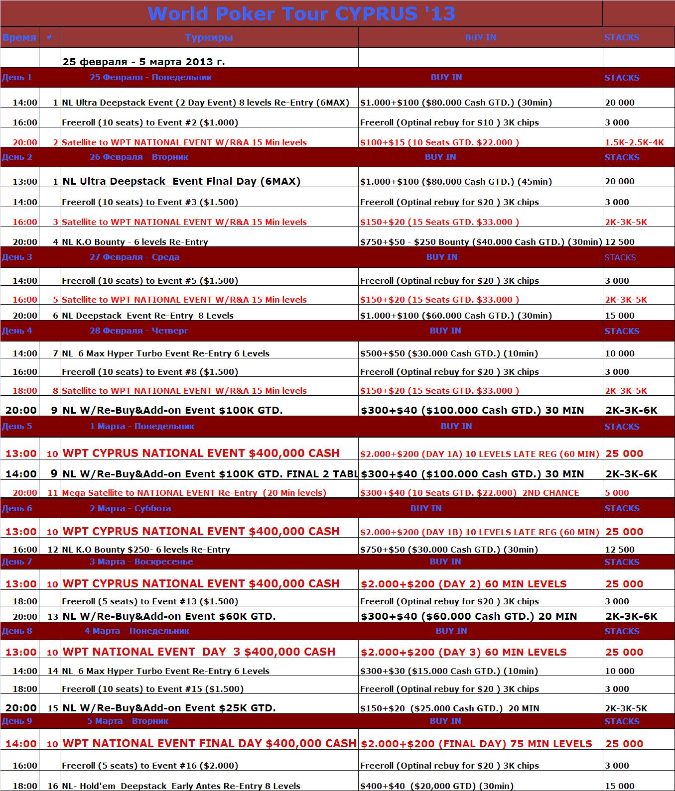 Buy-in на Main Event: $2200 ($2000+$200). Гарантия на Main Event $400.000. Структура WPT: стандартная для WPT Main Event — два стартовых дня, с возможностью повторного входа в день 1B. В рамках серии пройдут сателлиты, фрироллы, Deep Stuck Event и другие турниры. По традиции предлагаем спецпакеты. На эту серию их 2 вида "Полный пакет" и "Сателлит пакет". ВНИМАНИЕ! При покупке турнирных пакетов СТРАХОВКА В ПОДАРОК! (страхование туриста). 1) Полный пакет с 24 февраля по 5 марта 10 дней и ночей в отеле Merit Crystal Cove Hotel and Casino (питание и напитки «все включено»), ($2000 Single - $3000 Double) Трансфер из аэропорта (Ларнаки или Эрджана) до отеля и обратно ($150) 25 Февраля. Турнир #1 $1,100 NL Hold’em (6 Max) Ultra Deepstack турнир из 2 дней $60K Гарантия ($1,100) 26 Февраля. Турнир #3 $170 SATELLITE TO MAIN EVENT WITH REBUY $33,000 Гарантия ($320) 26 Февраля. Турнир #4 $800 NL Hold’em Bounty KO Event $40K Гарантия ($800) 27 Февраля. Турнир #6 $1,100 NL Hold’em Deepstack Event $60K Guarnteed ($1,100) 28 Февраля. Турнир #7 $550 NL Hold’em 6 MAX Hyper Turbo Event $30K Гарантия ($550) 28 Февраля. Турнир #9 $340 NL 100K WITH REBUY $100,000 Гарантия ($640) 1 Марта. Турнир #10 $2,200WPT MAIN EVENT NLH 400K CASH Гарантия 3 Марта.Турнир#13 $340 WITH REBUY 60K CASH Гарантия ($640) 4 Марта.Турнир #15 $170 NL 25K CASH EVENT WITH REBUY $25,000 Гарантия ($320) 5 Марта. Турнир #16 $440 DEEPSTACK $20K Гарантия ($440) Себестоимость пакета $10,260 (Single) $11,260 (Double) Спеццена со скидкой Single $8,000 Спеццена со скидкой DOUBLE $8,500 Итого Бай-инов в пакете на сумму: $8,110 **Если игрок пропускает какой-либо турнир по причине участия его в предыдущем турнире, то он получает стоимость участия пропущенного турнира наличными деньгами после окончания регистрации. 2)Сателлит пакет на WPT 24 Февраля – 05 марта,2013 10 дней и ночей в отеле Merit Crystal Cove Hotel and Casino (питание и напитки «все включено»), ($2000 Single - $3000 Double) Трансфер из аэропорта (Ларнаки или Эрджана) до отеля и обратно ($150) 25 Февраля. Турнир #2 $115 SATELLITE TO MAIN EVENT WITH REBUY $22,000 Гарантия ($225) 10 SEATS 26 Февраля. Турнир #3 $170 SATELLITE TO MAIN EVENT WITH REBUY $33,000 Гарантия ($320) 15 SEATS 27 февраля. Турнир #5 $170 SATELLITE TO MAIN EVENT WITH REBUY $33,000 Гарантия ($320) 15 SEATS 28 Февраля. Турнир #9 $340 NL 100K WITH REBUY $100,000 Гарантия ($640) 3 Марта. Турнир #13 $340 WITH REBUY 60K Гарантия ($640) 4 Марта. Турнир #15 $170 NL 25K CASH EVENT WITH REBUY $25,000 Гарантия ($320) Себестоимость пакета: $4,615 (Single) $5,615 (Double) цена со скидкой SINGLE $2,800 DOUBLE $3,200 Итого Бай-инов в пакете на сумму $2,465 *Если игрок пропускает какой-либо турнир по причине участия его в предыдущем турнире, то он получает стоимость участия пропущенного турнира наличными деньгами после окончания регистрации. Если вы хотите участвовать в турнирах по своему усмотрению или вас привлекают кеш игры, вы можете забронировать номер в отеле Мерит: ИНФОРМАЦИЯ И БРОНИРОВАНИЕ: +7 915 090 90 91 +7 925 507 45 95 Информация и бронирование онлайн: По почте: nv@pokercm.com, m@pokercm.com, arturpcm@gmail.com Skype: PCMTOUR Информация по телефону в Украине: +380 666 938 666 http://www.pokercm.com |