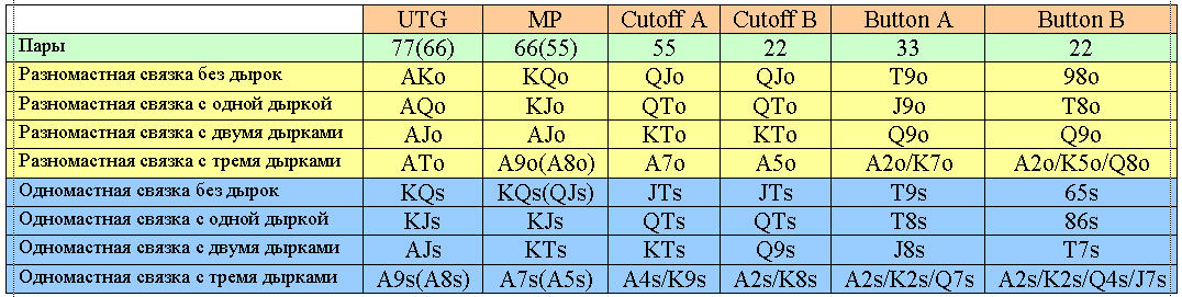 King Yao Оригинал: 2+2 Было несколько вопросительных тем о стандартах открывающего рейза для коротких столов, и я решил расписать, свои стандарты открывающего рейза для коротких столов от 3 до 6 игроков. Если я пишу руку как T9s, это означает Т9s, а также любую другую более старшую одномастную связку без дырок, например QJs или KQs. Руки в скобках (55) - руки, которые я могу добавить против пассивных, предсказуемых игроков. Примечание, я почти никогда не лимпингую входя в игру первым. Изредка я лимпингую из UTG с KQo/JTs, но их я перемешиваю с лимпингом из UTG с AA/KK, но так я делаю очень редко, и вероятно данное действие не заслуживает внимания. Если игра идет вчетвером столбцы UTG и МР просто отбрасываются, первый игрок будет начинать играть со столбца Cutoff (каттоф). В играх впятером, первой позицией будет МР. Для каттофа и баттона у меня по два столбца - A и B. Столбец A - для более жестких/агрессивных игр, в которых баттон и малый блайнд часто будут 3-бетить. Столбец B - для более пассивных и предсказуемых игр, в которых игроки меньше полублефуют. В этой таблице не идет речь о ситуациях, когда перед Вами уже есть лимперы или был рейз, он предназначен только для тех случаев, когда Вы - первый ставящий. Обсуждение stripsqueez Интересная тема, но вообще то в этом виде игры существует много ситуаций с пограничными позициями или решениями, я не люблю сводить все к таблице, потому что она не учитывает реального положения за столами - я уверен, что многие согласятся с этим пунктом. Рассмотрим ситуацию Shania - Вы рейзуете из позиции UTG только с AA KK QQ AKs и 72o, и ваши противники об этом знают, вероятно, Вы могли бы выигрывать и с 72o. Я просмотрел свои данные из poker trackerа (60 000 рук) по открывающему рейзу из позиции UTG - и думаю, что я должен разыгрывать больше рук из позиции UTG, потому что все они были большими победителями (кроме 1 или 2, которые я спишу на статистическое отклонение, поскольку они не были пограничными руками) – а если говорить точнее то это QТs и QJs. В позиции UTG ваши рекомендованные руки очень близки к моему выбору рук, с позиции баттона ваш выбор более лузов, чем мой - я могу предложить, что это из-за позиционного преимущества и возможного сброса карт противником, но такой стилинг рассчитан только на очень слабых противников. King Yao Цитата: я не люблю сводить все к таблице, потому что она не учитывает реального положения за столами - я уверен, что многие согласятся с этим пунктом. Я соглашусь ... в реальности, я не использую таблицу, когда я играю (но я ее помню), я играю по чувству, но мое "чувство" так или иначе должно быть близко к этой таблице. Я привел эту таблицу по двум причинам: 1. для себя, чтобы улучшить свою собственную игру... 2. для других, которые спрашивали. Цитата: Рассмотрим ситуацию Shania - Вы рейзуете из позиции UTG только с AA KK QQ AKs и 72o, и ваши противники об этом знают, вероятно, Вы могли бы выигрывать и с 72o. Я не уверен, что понимаю значенье "Shania" (72o? или какая та другая терминология?) ... так или иначе, если бы все 5 ваших противников знали, это было бы очень нетипичная сетевая игра..., а если бы 1 или 2 противника не были в курсе вашей игры, такой розыгрыш не стал бы для Вас развлечением. В следующий раз сообщите мне, когда почувствуете, что находитесь в игре, где Вы могли из UTG выигрышно ставить с 72o, и я вероятней всего увижу, что Вы покинули эту игру 15 минутами ранее .Цитата: Я просмотрел свои данные из p