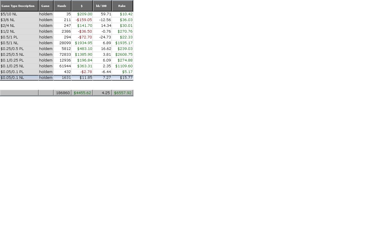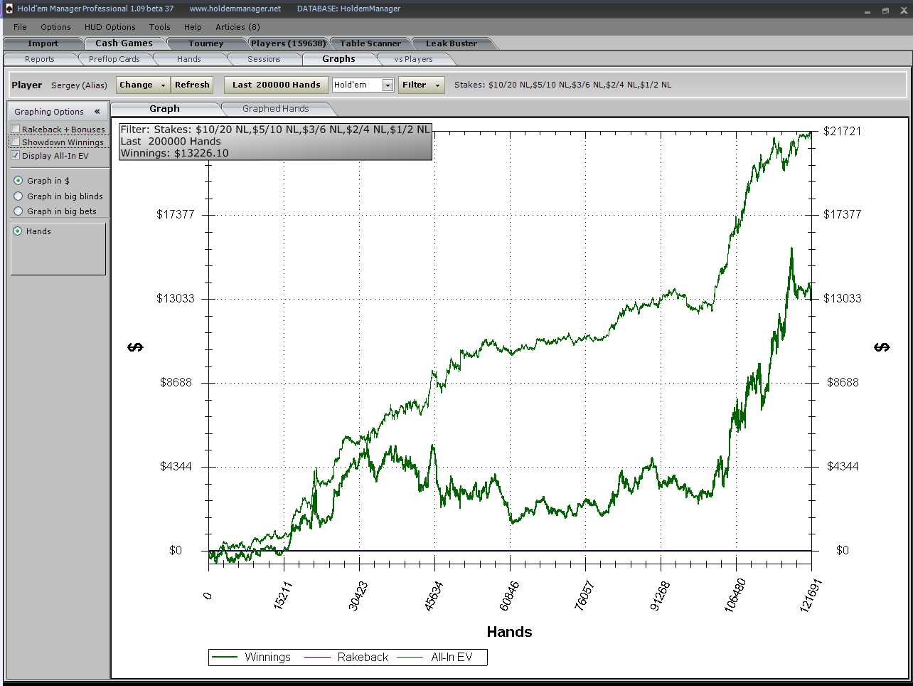 Обучаю по скайпу , варианты обучения : 1. Вы играете , а я слежу за вами и даю вам советы прямо во время сессии . 2. Анализ хендхистори , вы просматриваете свои сыгранные раздачи в холдемменеджере или покертрекере , а я указываю вам на ошибки . Обучение ведется на лимитах от NL10 до NL100 включительно . Цена обучения 20 $ в час не зависимо от выбранного вами варианта . Немного о себе : я открыл идеальный стиль игры совсем недавно ,как вы видете на графике ,за первые 96 тысяч рук я зарботал всего лишь 617 $ , тогда то и случилось просветление , я понял что нужно изменить и за следующие 90 тысяч рук выиграл 3800$ ! Так же хочу отметить что научиться играть в + стеком 20бб гораздо проще чем стеком 100бб , новичкам нужно начинать именно с стратегии коротких стеков - это может каждый! Желающие начиться обращайтесь в личку или в ICQ 2-один-4-666-943 или на мыло NEWCAMPION@RAMBLER.RU Если какая нибудь покерная школа хочет нанять меня тренером в свой штаб , сразу пишите ваши условия - рассмотрю все предложения. P.S. Винрейт плюсового регуляра- шортстека обычно 1-2 бб/100 ,мой винрейт на нл50 3.8бб/100 многие СССники покерстретеджи считают просто заоблачным , а винрейт на нл100 вообще космический для шортсетка. |