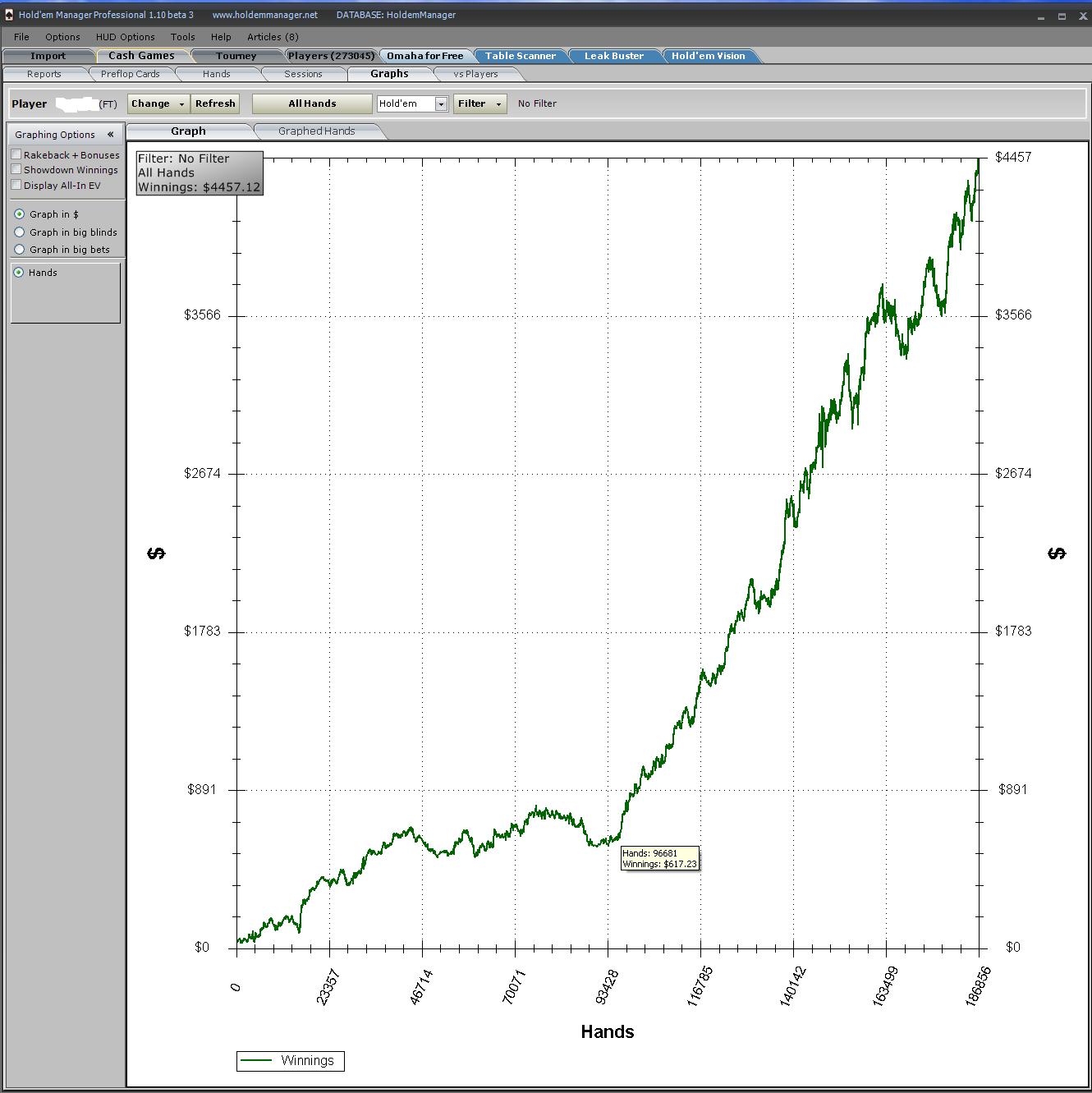 Немного о себе : я открыл идеальный стиль игры совсем недавно ,как вы видете на графике ,за первые 96 тысяч рук я зарботал всего лишь 617 $ , тогда то и случилось просветление , я понял что нужно изменить и за следующие 90 тысяч рук выиграл 3800$ !