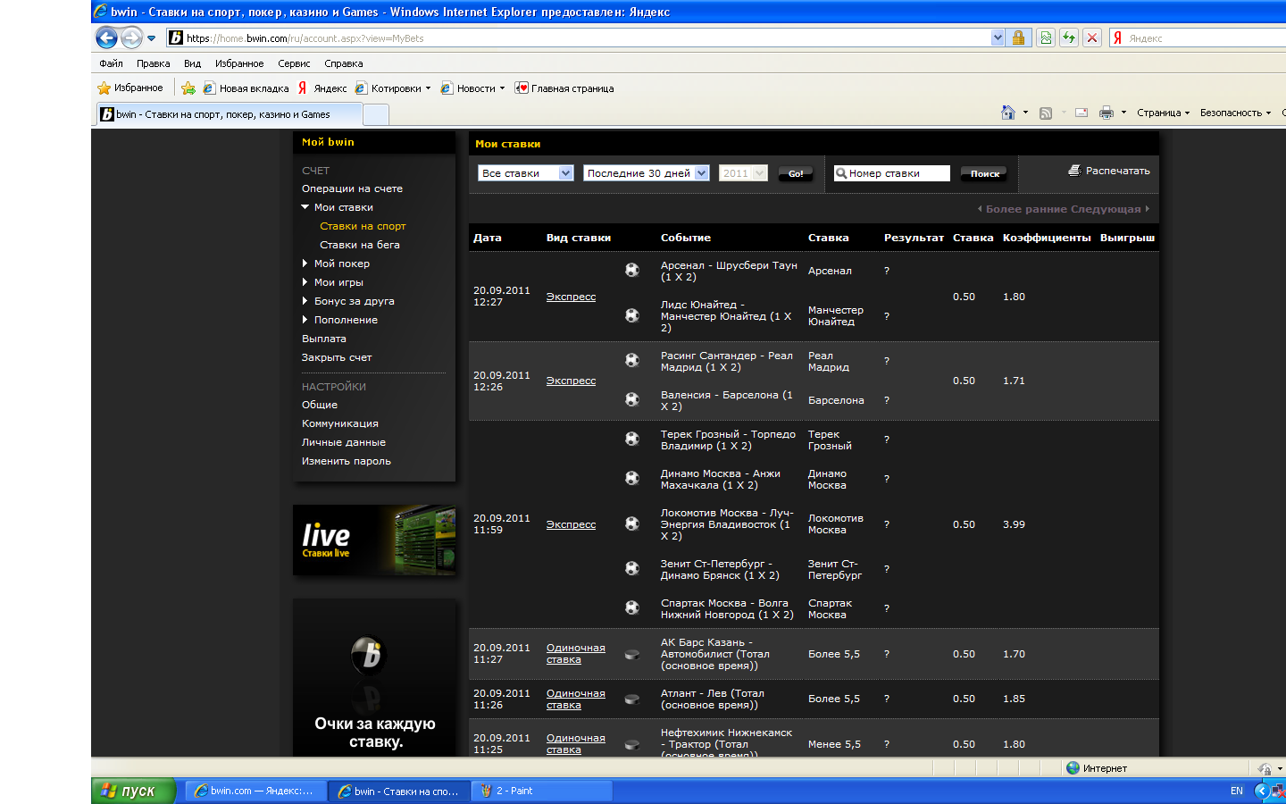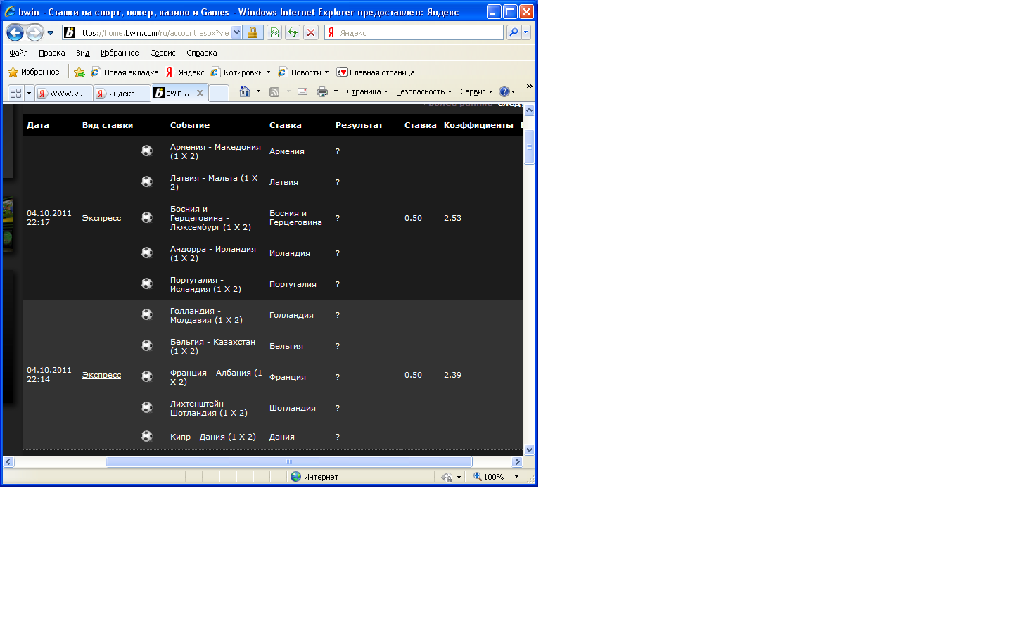 .Играли вообще "никак".Позор...Меня уже достали знакомые "поздравлять"-хоть телефон отключай.В пятницу утром,перед работой,сделал три ставки.Первая вчера сыграла(ТБ 3,5 на Байер),вторая сегодня вряд ли сыграет(тоже самое на Арсенал).А вот третья...Впихнул на какой-то матч бельгийского чемпионата.На какой-не помню