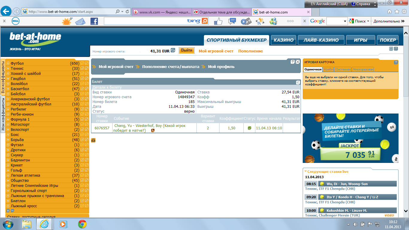 .2)Денвер-Сан Антонио.Гонка до 50 очков.Денвер за 2.0.Не зашло .3)Портленд-ЛА Лейкерс П1 за 2.15.Не зашло .Тильт .И как следствие:4)Теннис.Чанг-Вестерхоф П2 за 1.5 на весь БР .Соскочил :Потерял бОльшую часть профита.Жаль,эта ставка не вошла в отбитие бонуса.Буду думать дальше .5)ТБ 1.5 Рубин-Челси+ТБ 2.5 Tanjong Pagar-Woodlands Wellington(это Сингапур) за 2.06.Не зашло .6)ТБ 1.5 в первом тайме матча Clairvaux-Jimboomba(Австралия.Футбол.) за 2.0.Не зашло .7)Молодежка.Динамо-ЦСКА П1 за 2.0.Зашло .8)В матче №6 ТБ 3.5 за 2.05 двойной ставкой.Зашло без проблем .9)Молодёжка Шинника-Динамо(Кострома) ТБ 1.5 за 2.2.Зашло .10)Хоккей.Чемпионат мира до 18 лет.Победа Норвегии+победа Дании за 2.03.Зашло .11)Победа Лацио+ТБ 1.5 в Казани за 2.39.Не зашло .12)Победа Тоттенхема за 3.0.Не зашло .13)Победа Бенфики за 2.15.Не зашло .14)Победа Франции в матче со Словенией(хоккей молодёжный) за 2.1.Зашло .На сегодня хватит... 15)На ночь-ТБ 2.5 Палмейрас-Либертад двойной ставкой за 2.0.Не зашло .Последний раз редактировалось Myteam 12 апр 2013, 06:45, всего редактировалось 13 раз(а).
